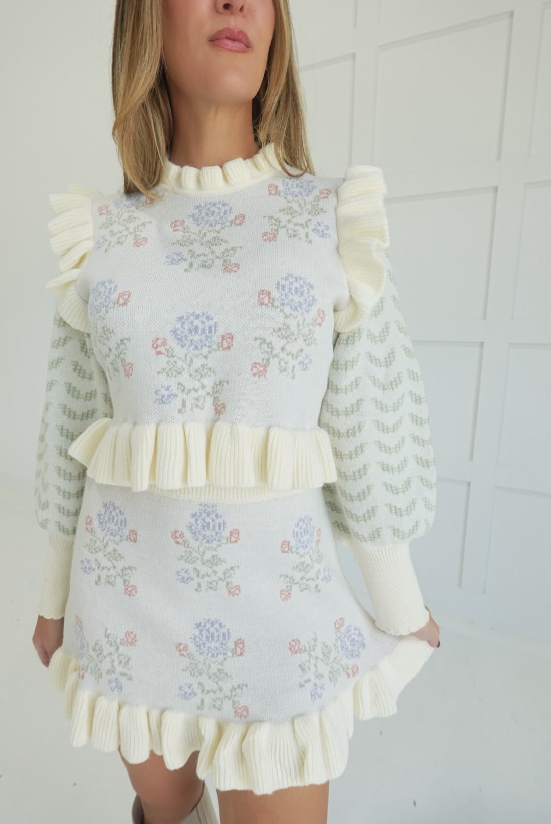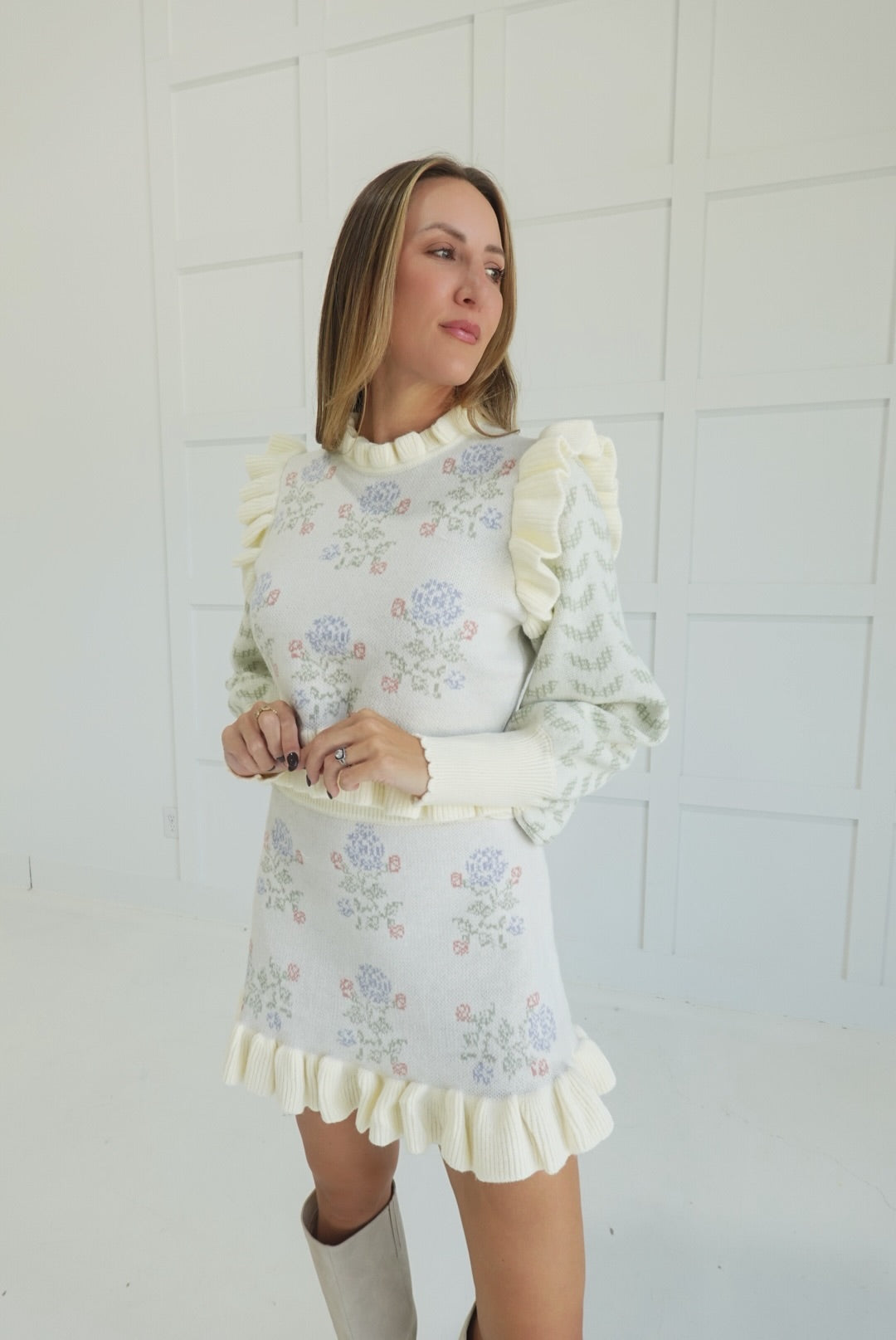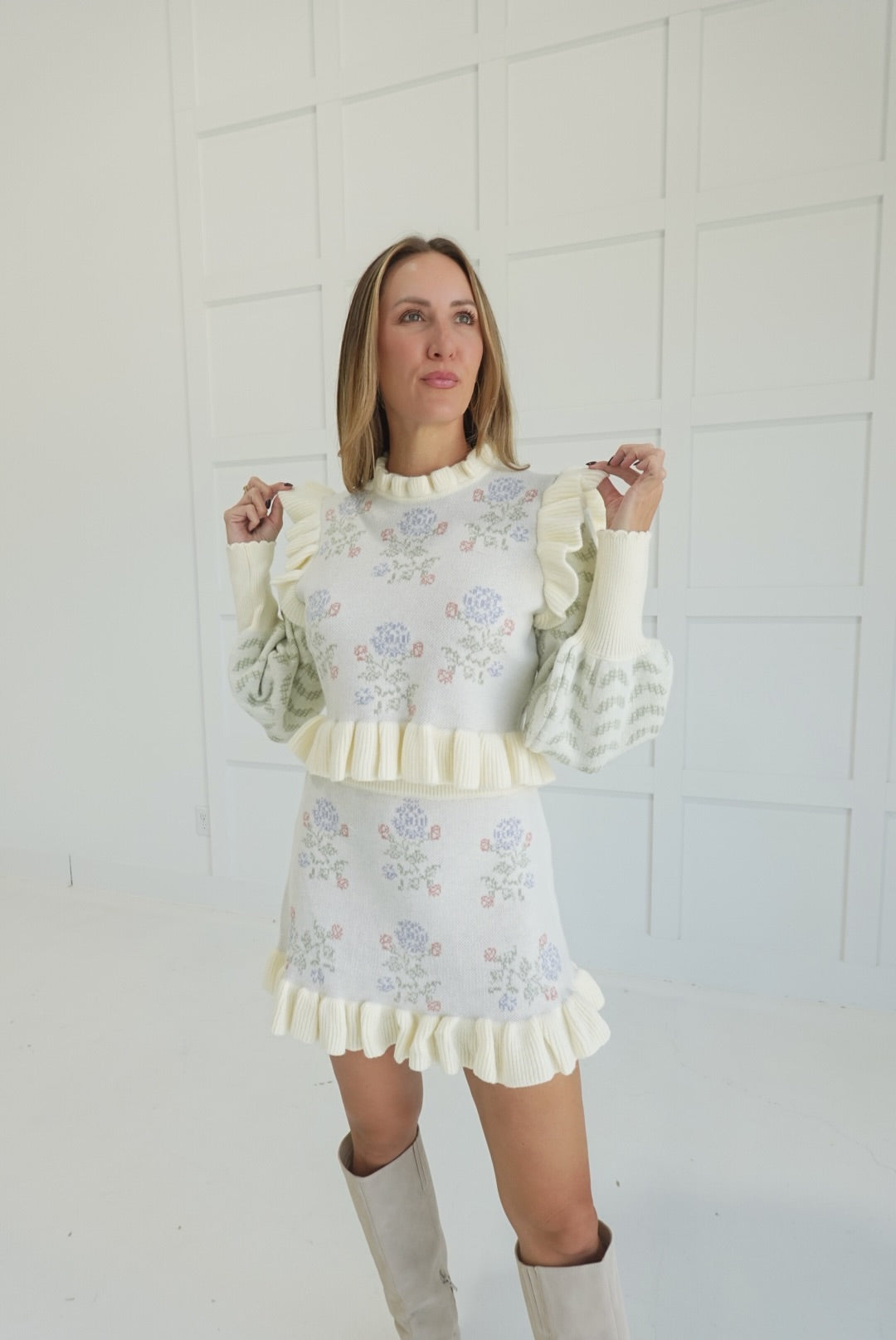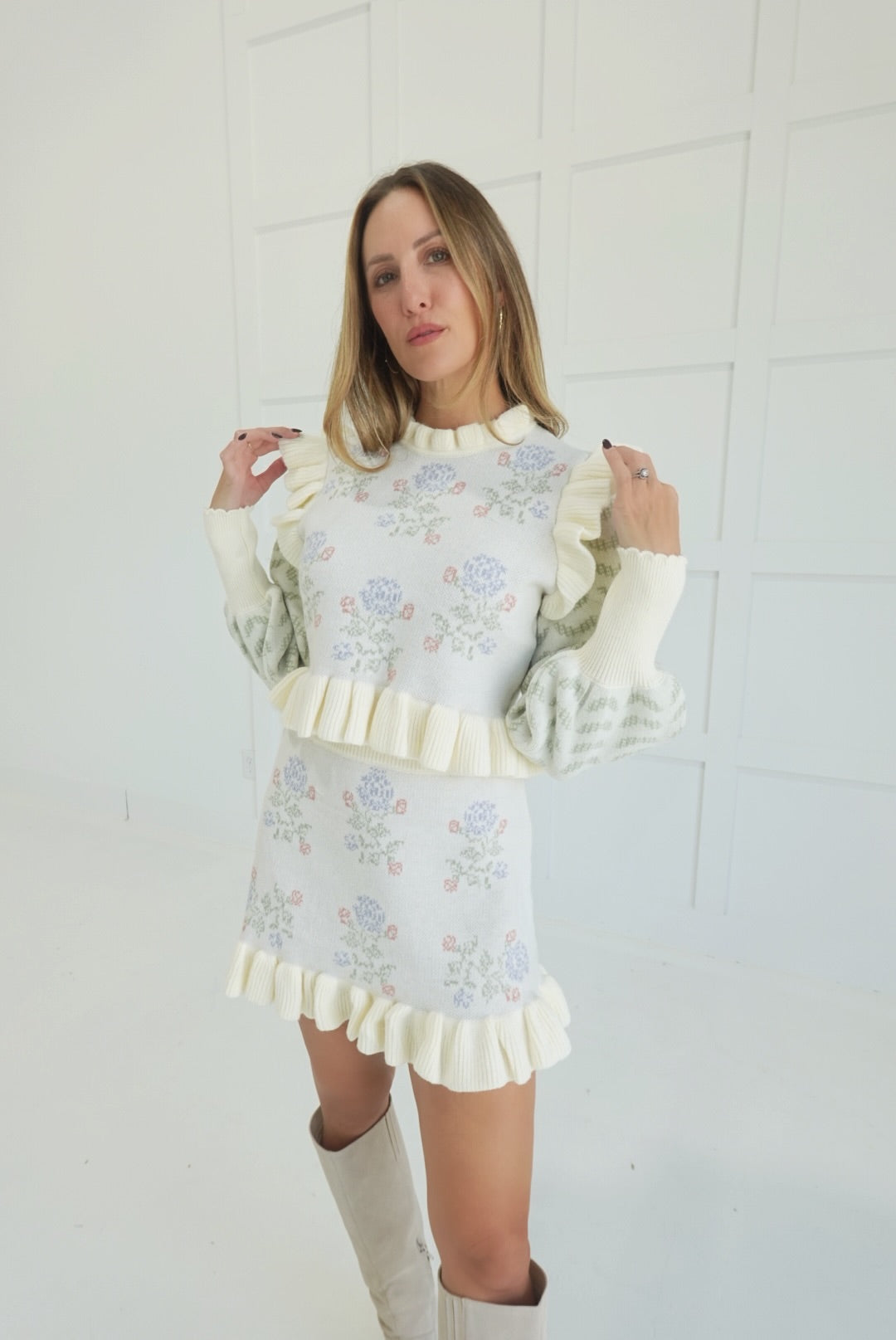 Embrace effortless style with the Falling In Lust Set, featuring a floral ruffle detail knit top paired with a coordinating mini skirt. This set combines delicate feminine touches with comfortable knit fabric, perfect for both casual outings and special occasions. The ruffle accents add a charming flair, while the mini skirt offers a flattering fit that moves with you. Elevate your wardrobe with this easy-to-wear ensemble designed to make you feel confident and chic.