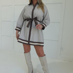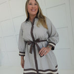The Family Owned Dress is a woven mini dress that elegantly combines a classic stripe pattern with modern details. Featuring ¾ sleeves and a waist tie, it offers a flattering silhouette. The contrast collar band and button-front closure add refined touches, while the multicolor bands on the sleeves and hem provide subtle sophistication. Fully lined for comfort, this dress is a timeless addition to any wardrobe.