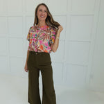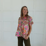 The Farris Linen Blend Blouse offers a comfortable, breathable fit with its soft linen blend fabric. Featuring a charming pink and multicolored button-down design, this short-sleeve top is enhanced by a subtle lace insert that adds a delicate touch without overwhelming the look. Perfect for warm days, it combines style and ease, making it a versatile addition to your wardrobe.