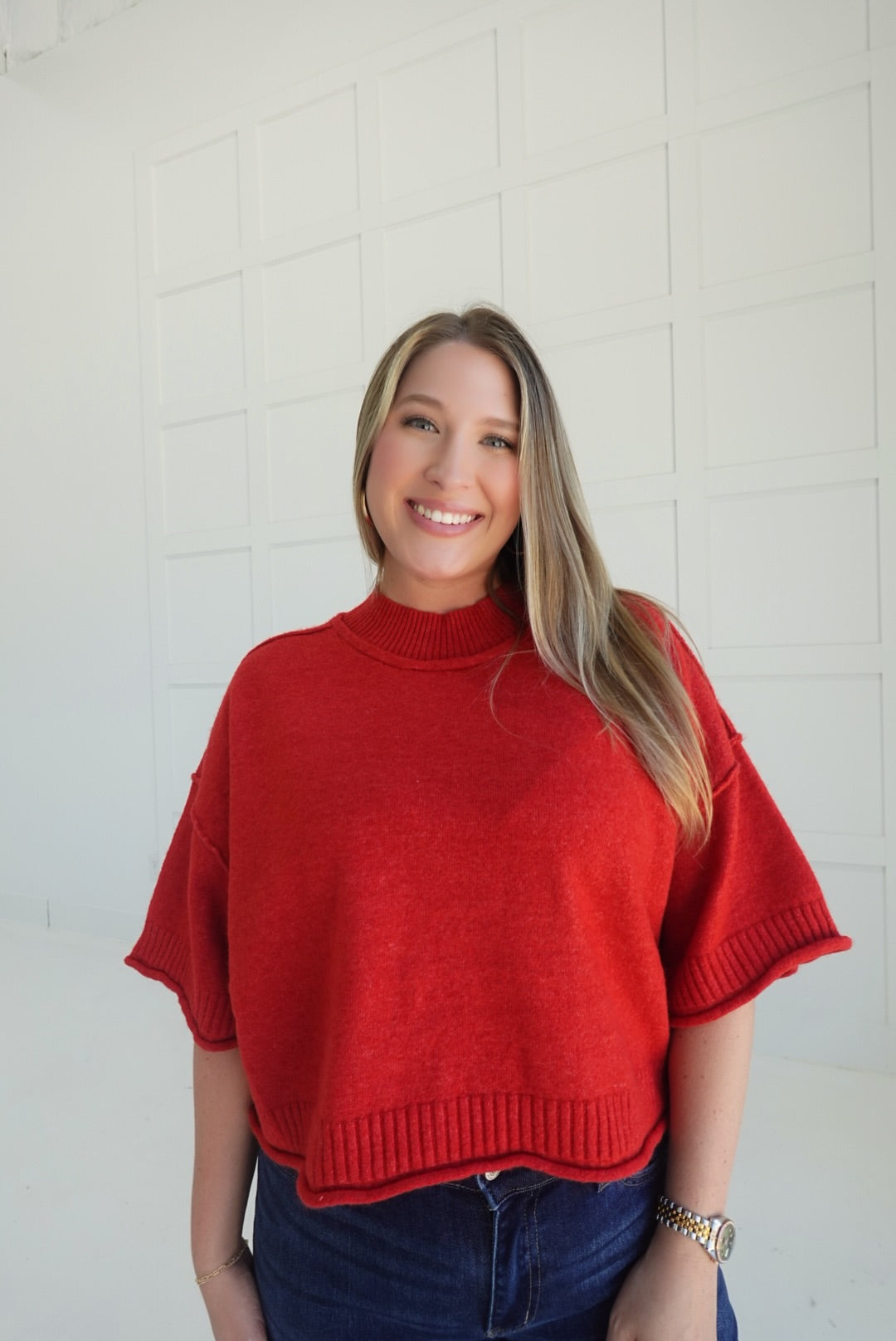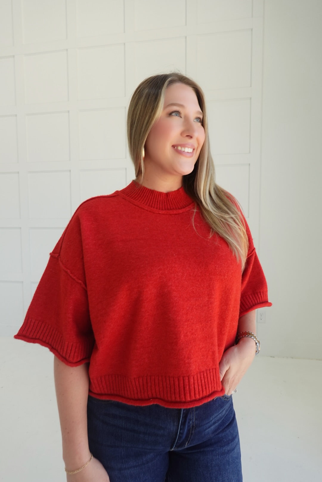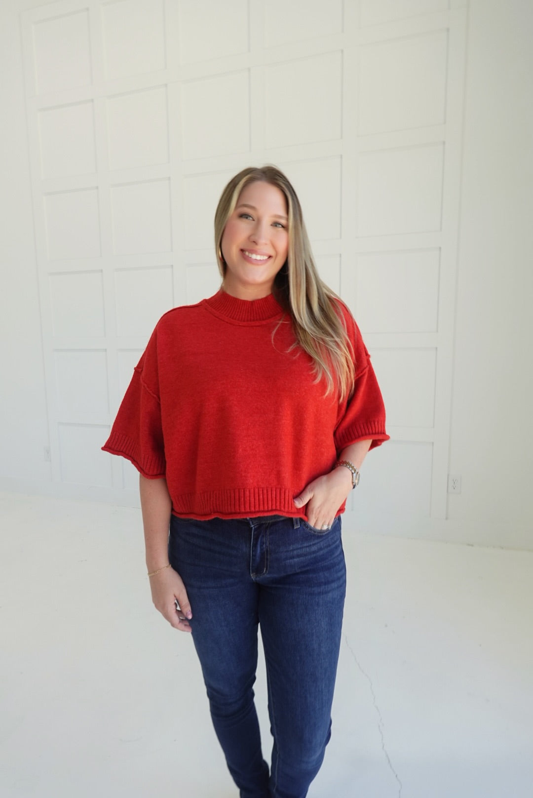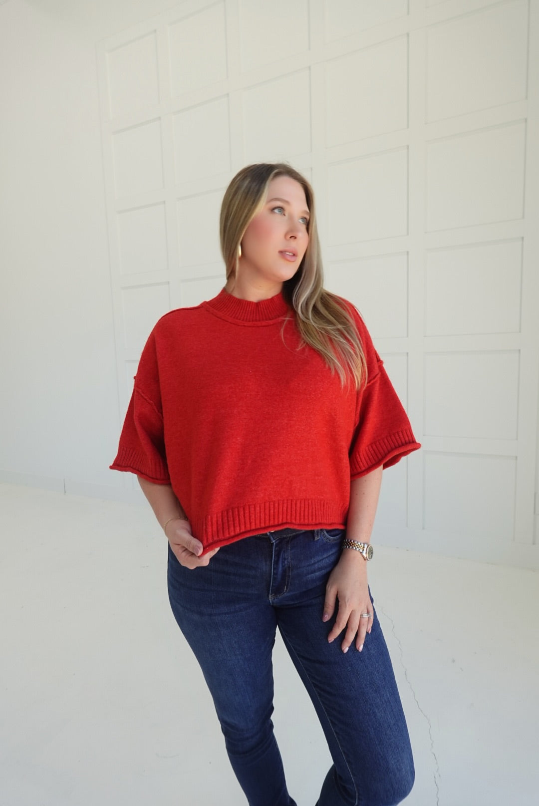 The Fatal Reaction Sweater combines comfort and style with its mock neck and short sleeves, making it an ideal choice for transitional weather. Its soft fabric gently embraces your skin while the mock neck adds a touch of sophistication. Perfect for layering or wearing alone, this sweater supports your everyday comfort without sacrificing a polished look.