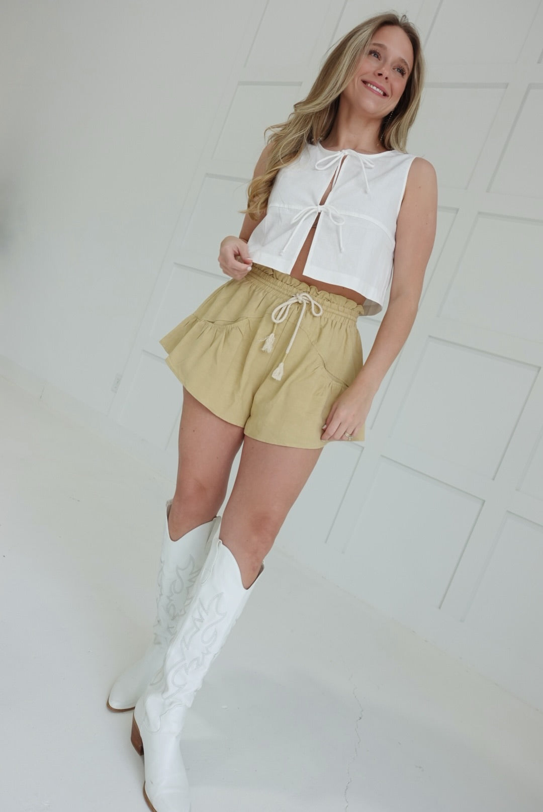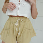 Step into summer with our Faye Front Flare Shorts in mustard. These ruffle banded tie front shorts not only provide a comfortable fit, but also add a playful flare to your outfit. Perfect for a day out in the sun or a casual evening look.