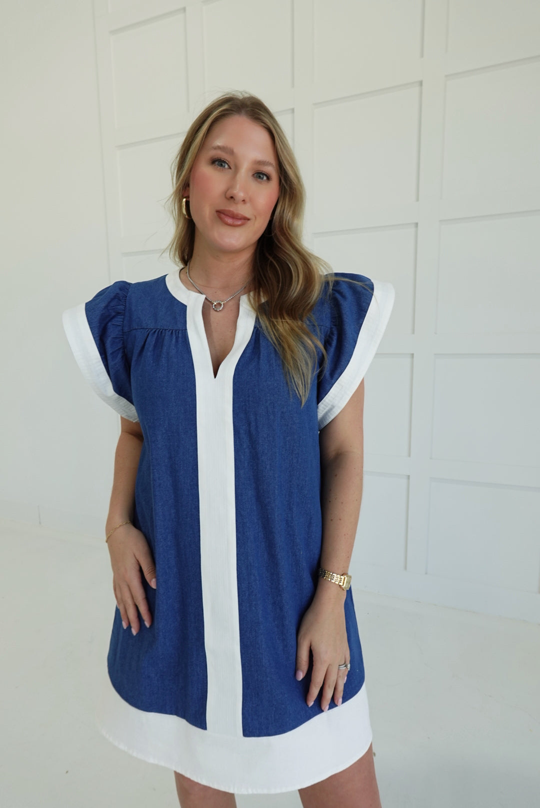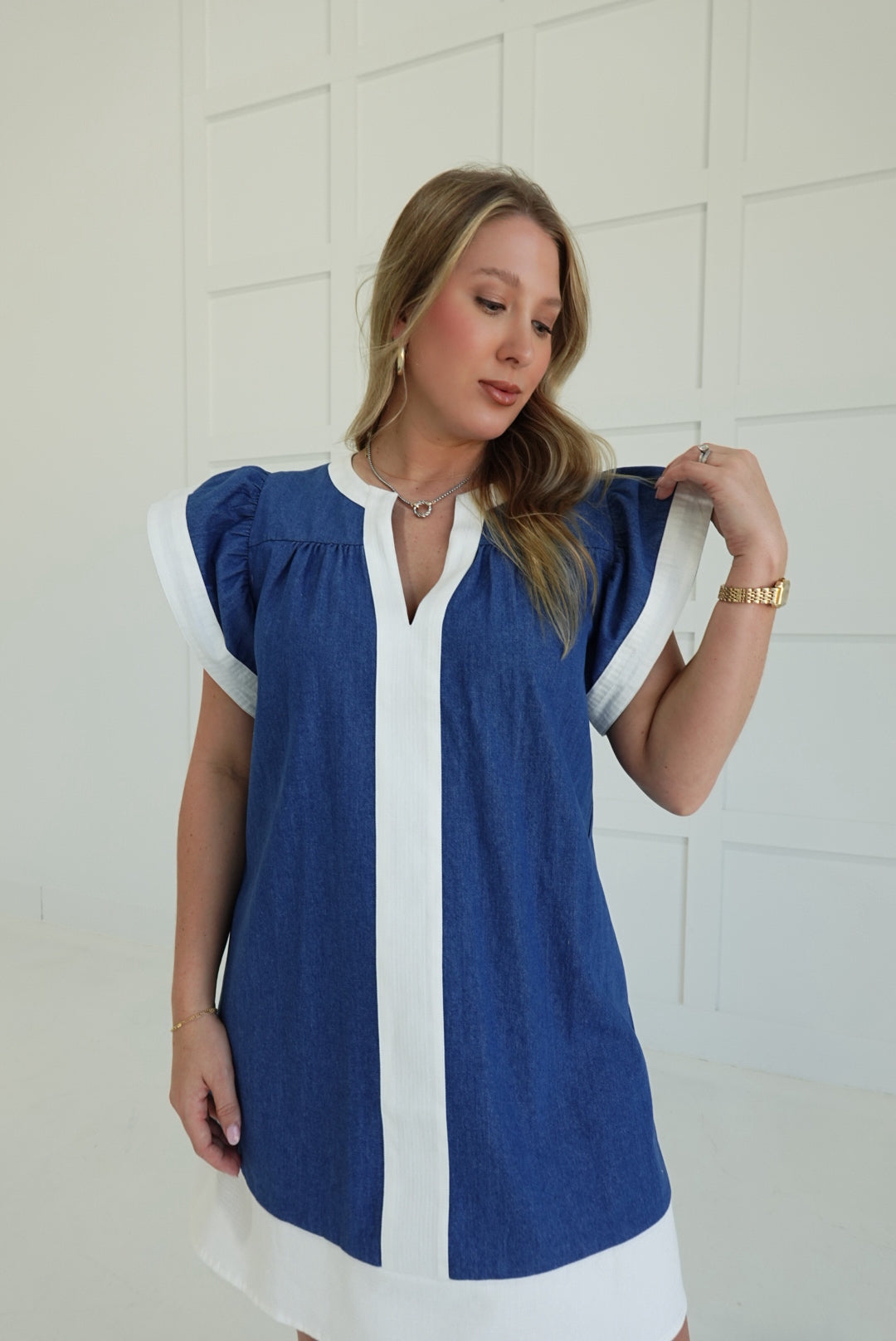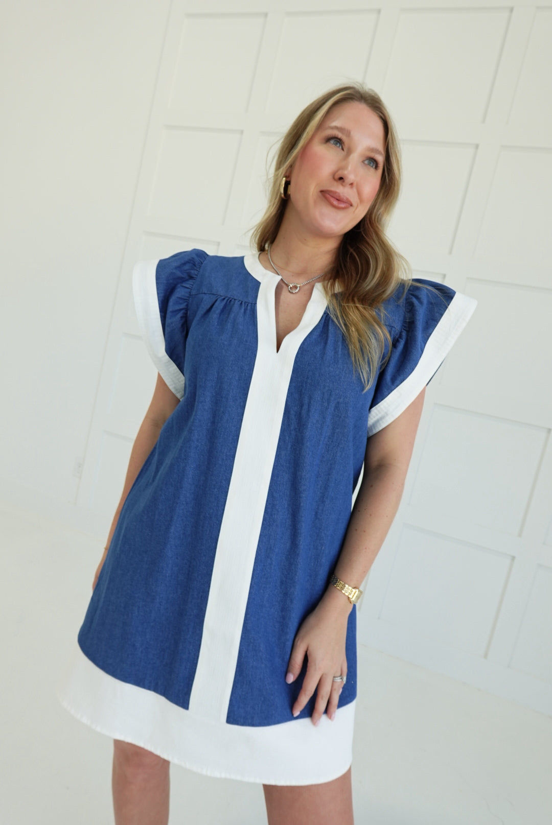 Flutter Sleeve Denim V-Neck Mini Dress Dare to turn heads in this bold denim mini dress, designed with a plunging V-neckline that commands attention. Delicate flutter sleeves add a playful edge while keeping the silhouette sharp and modern. The crisp denim fabric delivers timeless durability with contemporary attitude. Perfect for those ready to make a statement—pair with heels for evening impact or sneakers for fearless daytime style. This is the dress for women who refuse to blend in.