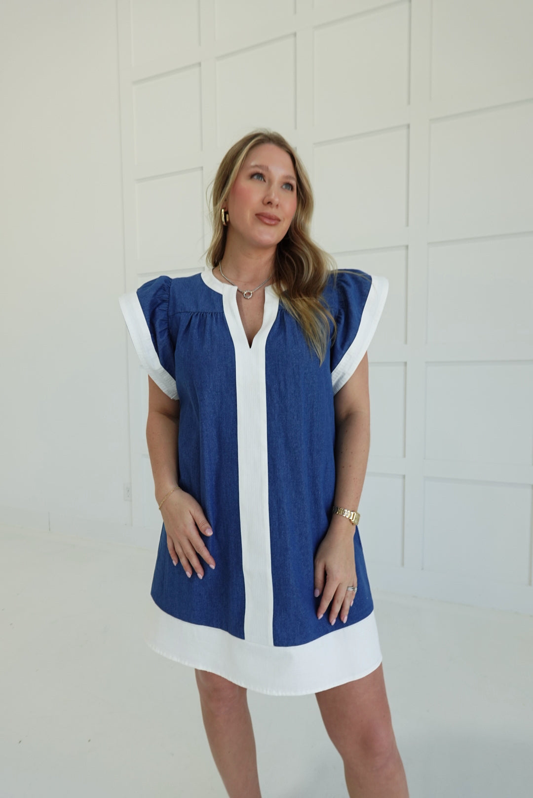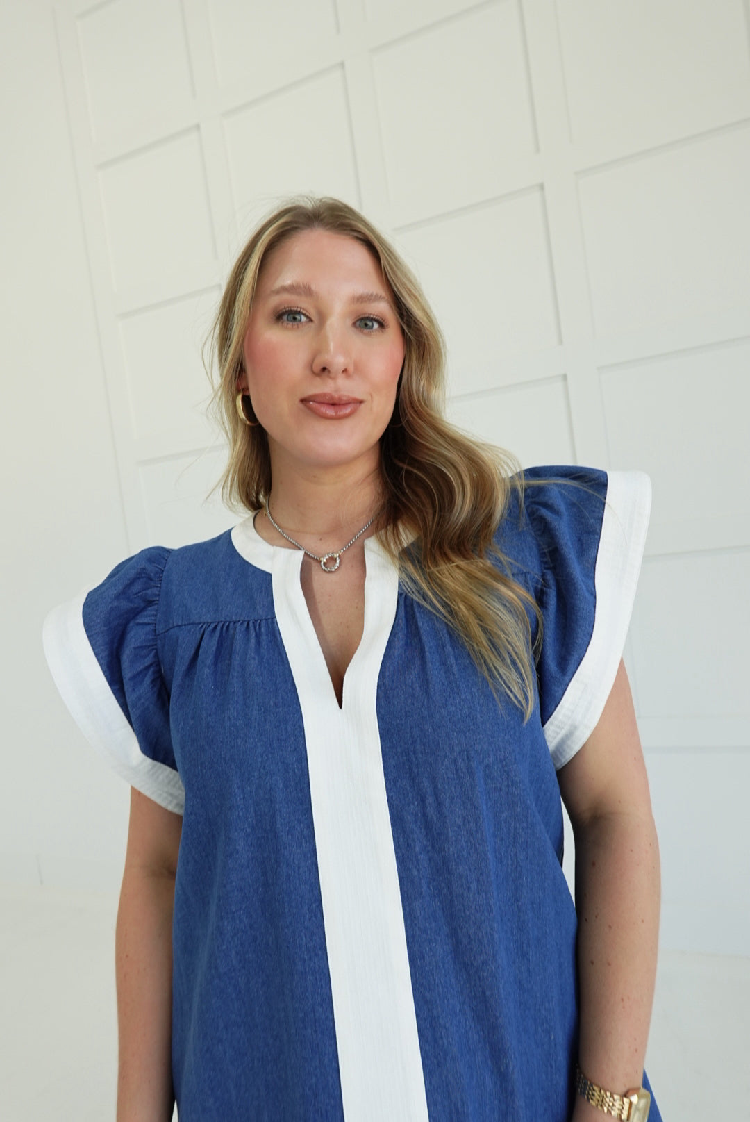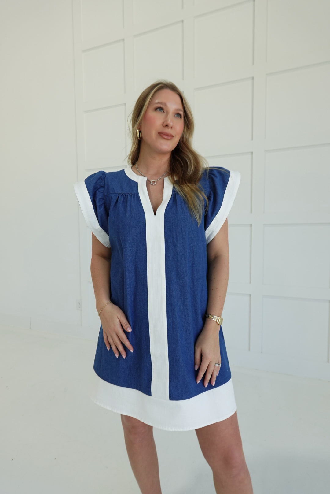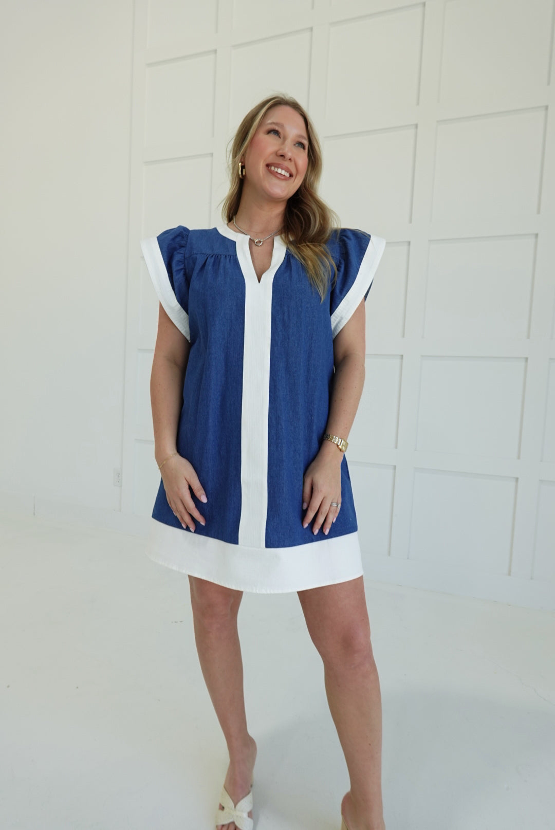 Flutter Sleeve Denim V-Neck Mini Dress Dare to turn heads in this bold denim mini dress, designed with a plunging V-neckline that commands attention. Delicate flutter sleeves add a playful edge while keeping the silhouette sharp and modern. The crisp denim fabric delivers timeless durability with contemporary attitude. Perfect for those ready to make a statement—pair with heels for evening impact or sneakers for fearless daytime style. This is the dress for women who refuse to blend in.