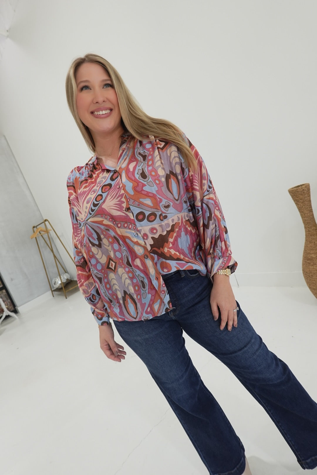 The Finer Things Blouse offers a relaxed, loose fit that ensures comfort throughout your day. Its button-down design adds a touch of classic style while being effortlessly versatile for both casual and dressier occasions. Enjoy breathable fabric that moves with you, making it an ideal choice for staying comfortable without sacrificing elegance.
