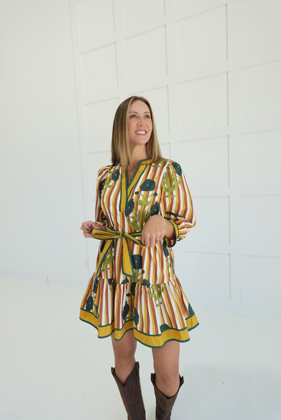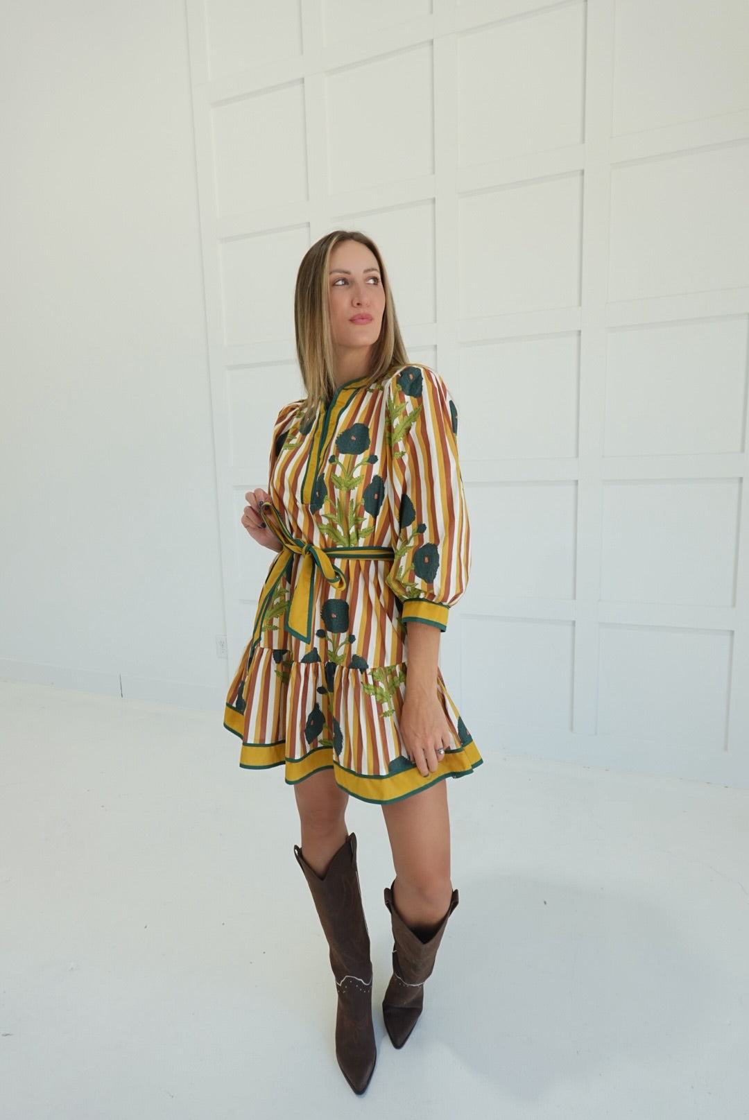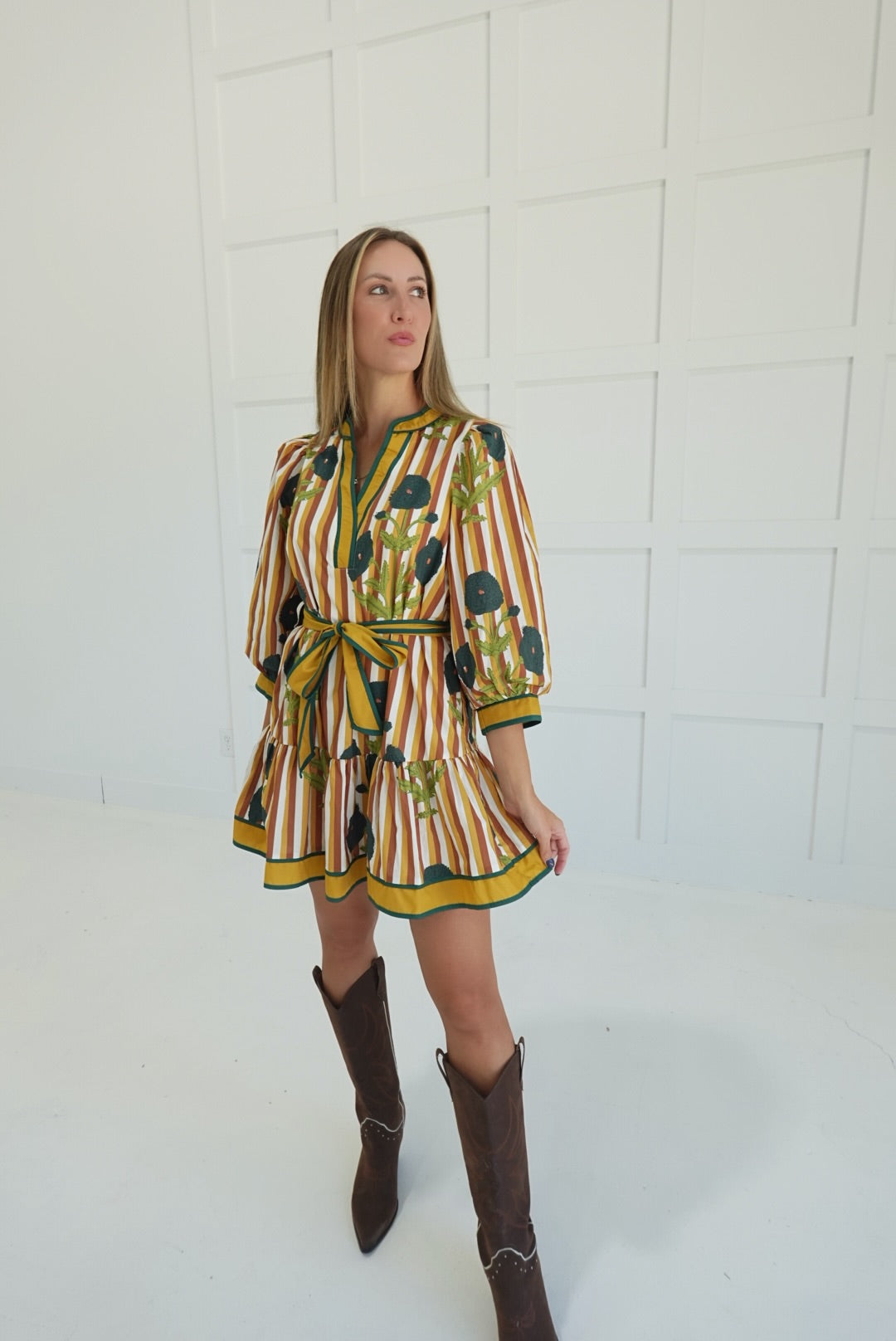 This Flourishing Mini Dress combines a charming floral stripe print with a flattering V-neck trimmed in contrast for added detail. The 3/4 puff sleeves and ruffle hem bring a touch of playful elegance, while the adjustable self-tie belt lets you customize the fit at the waist. Lightweight and fully lined with side pockets, this woven dress offers comfort without being sheer, perfect for effortless everyday style.