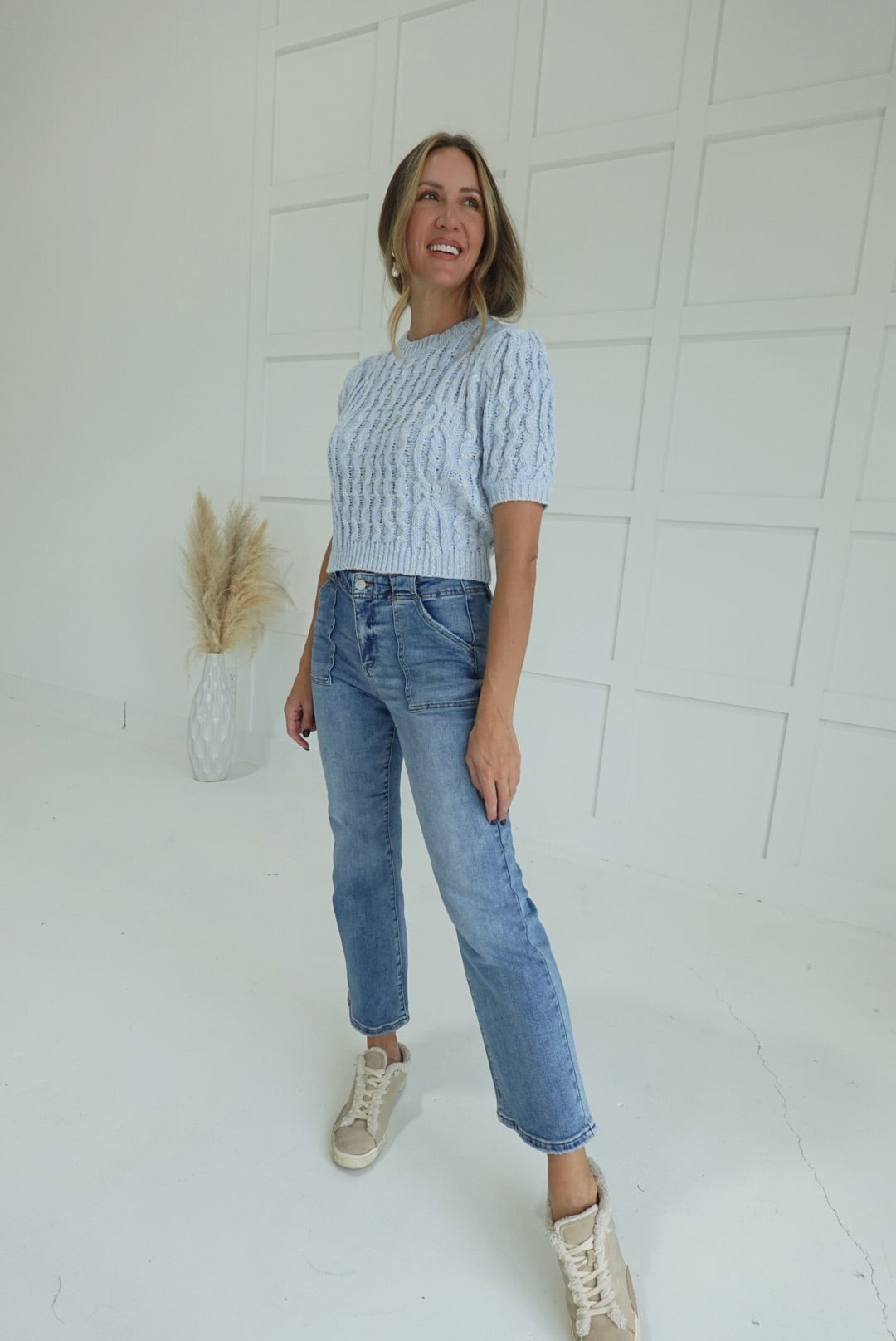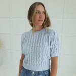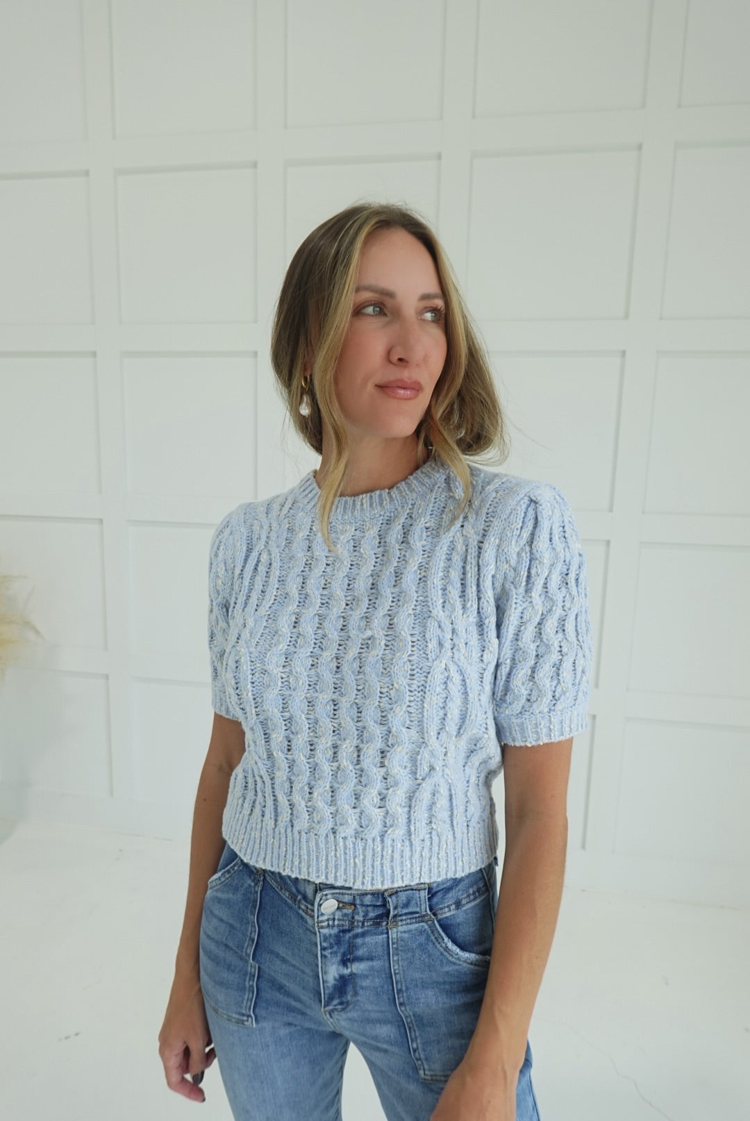 The Fly By Me Sweater in light blue blends cozy cable knit texture with a breezy short sleeve design. Perfect for layering or wearing alone, it offers comfort and style for transitional weather. Its soft fabric and relaxed fit keep you comfortable while adding a charming touch to any outfit.