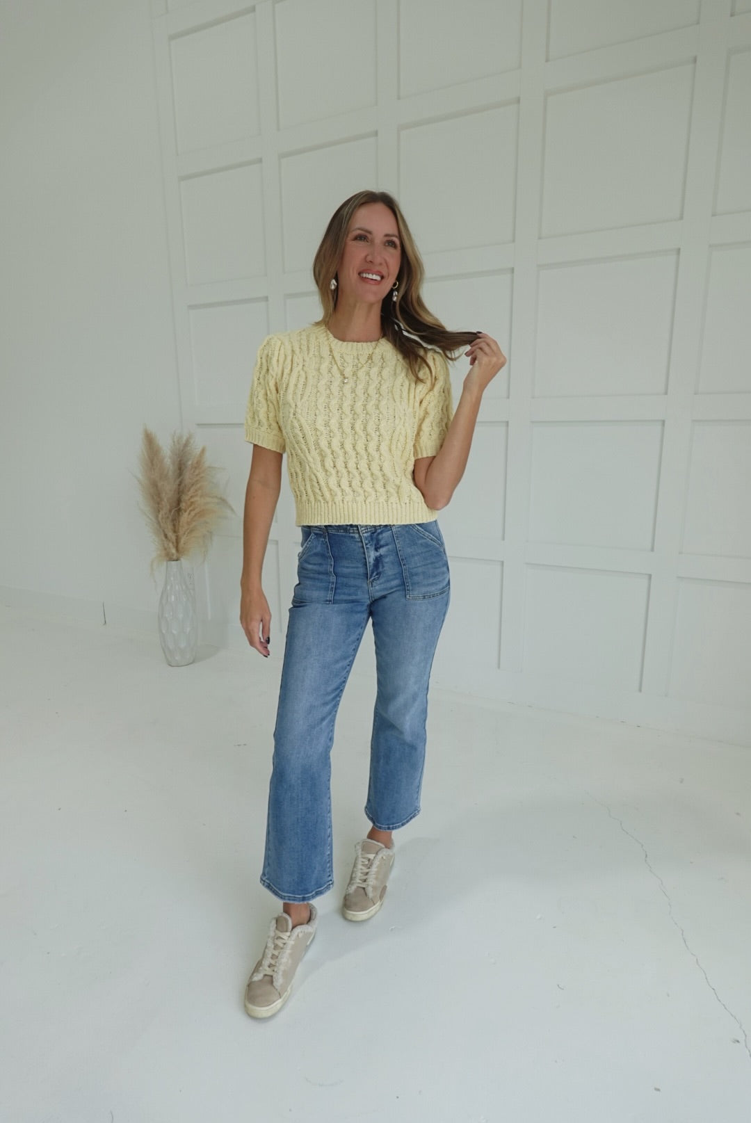 The Fly By Me Sweater blends cozy cable knit texture with a breezy short sleeve design. Perfect for layering or wearing alone, it offers comfort and style for transitional weather. Its soft fabric and relaxed fit keep you comfortable while adding a charming touch to any outfit.