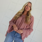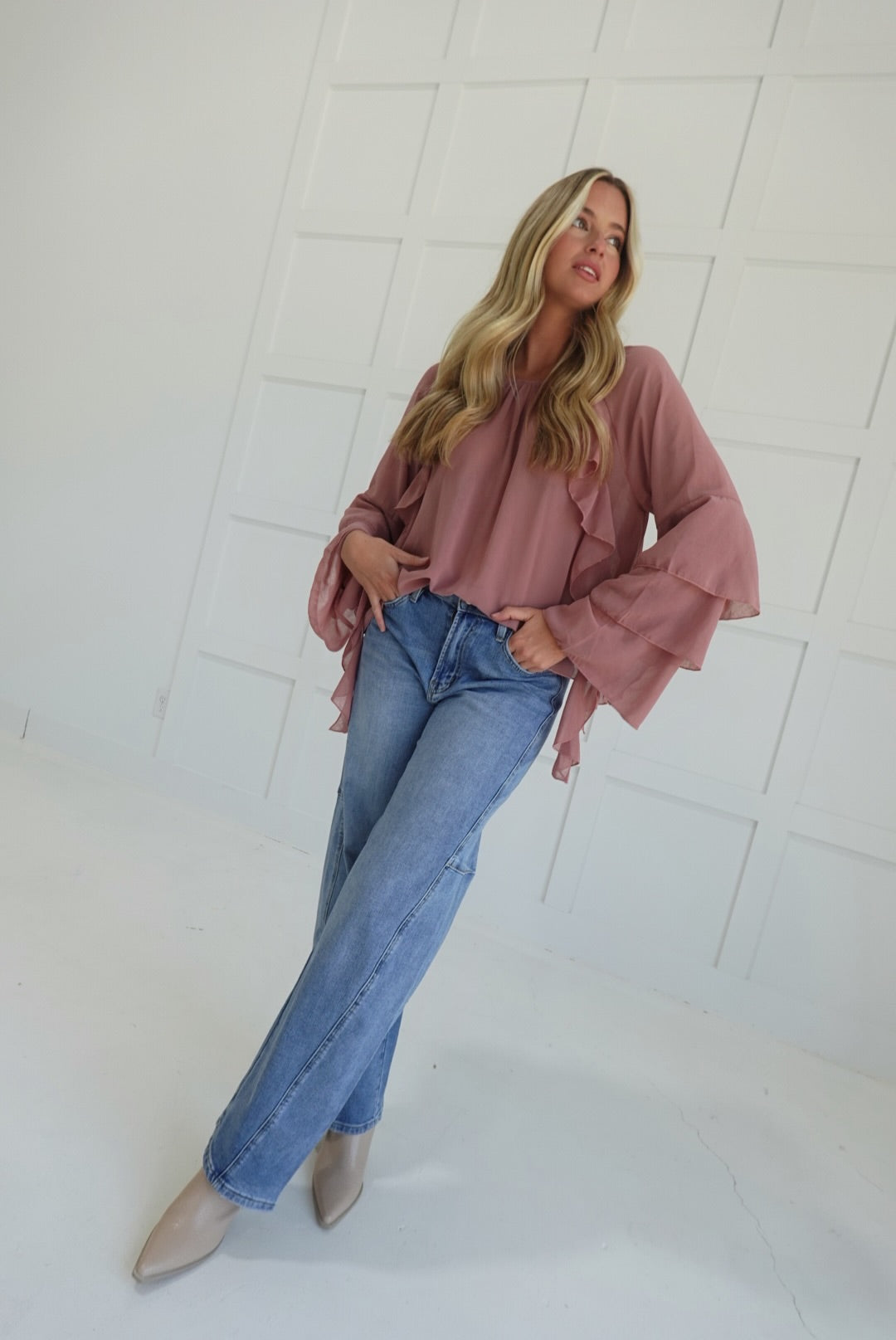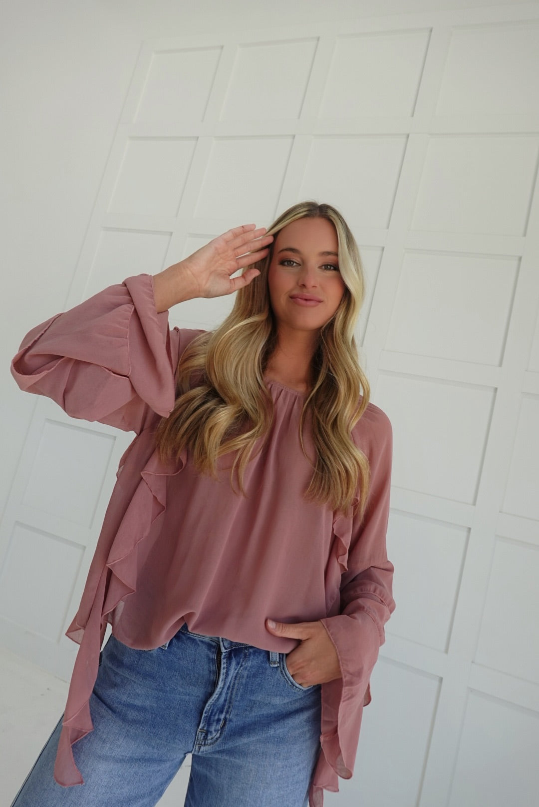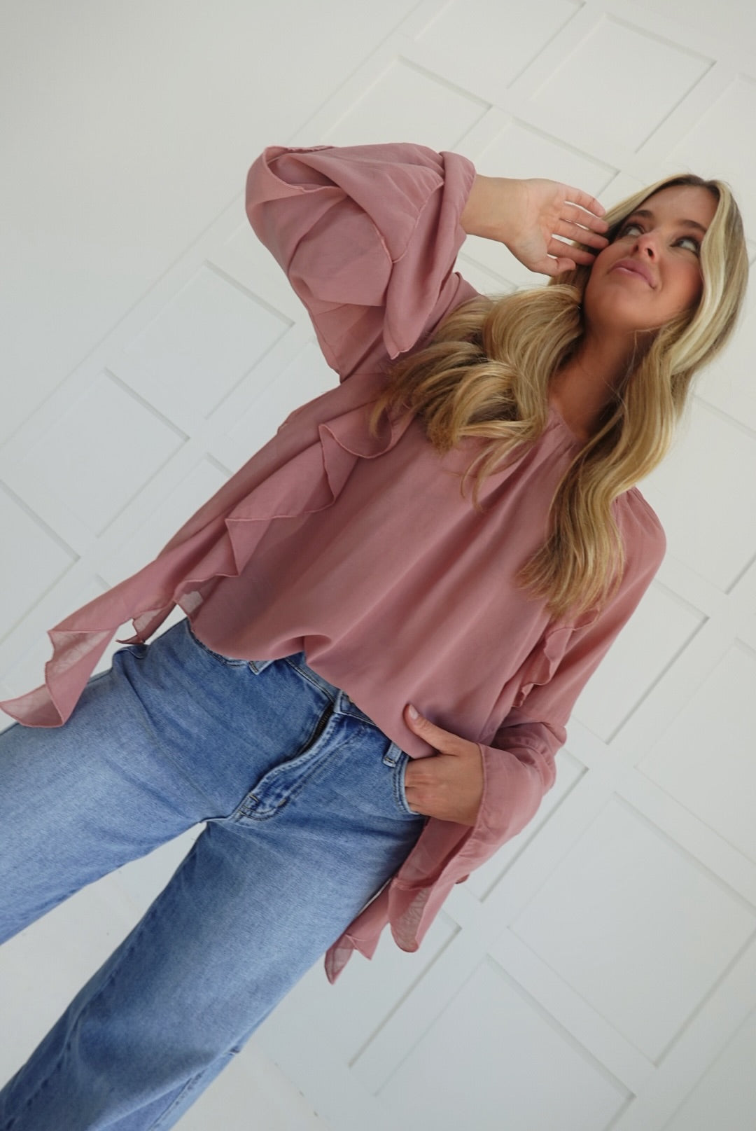 Elevate your wardrobe with the For the Frill of It Blouse, designed with delicate chiffon fabric and charming ruffle details that add a graceful touch. The bell sleeves create a flowing silhouette, offering both comfort and style for any occasion. Perfect for layering or wearing on its own, this blouse enhances your look with effortless femininity and movement.