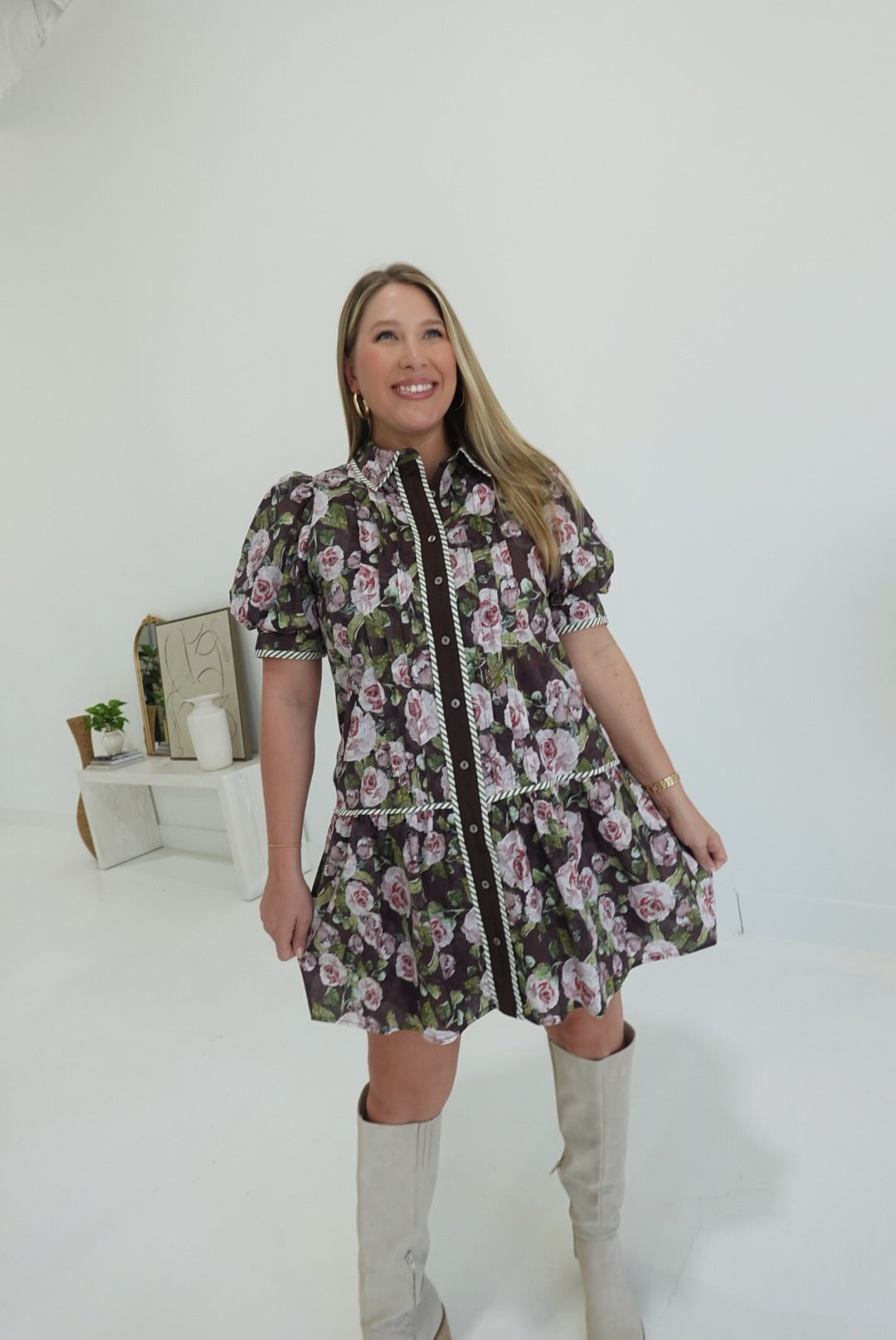 The Forsyth Mini Dress combines a charming floral print with delicate short puff sleeves for a feminine look. Its contrast stripe binding trim and button-front closure add subtle style details. Designed with a side pocket and a lightweight, non-sheer woven fabric, this lined dress ensures comfort and practicality. Perfect for warm days, it offers ease of movement while keeping you confidently stylish.