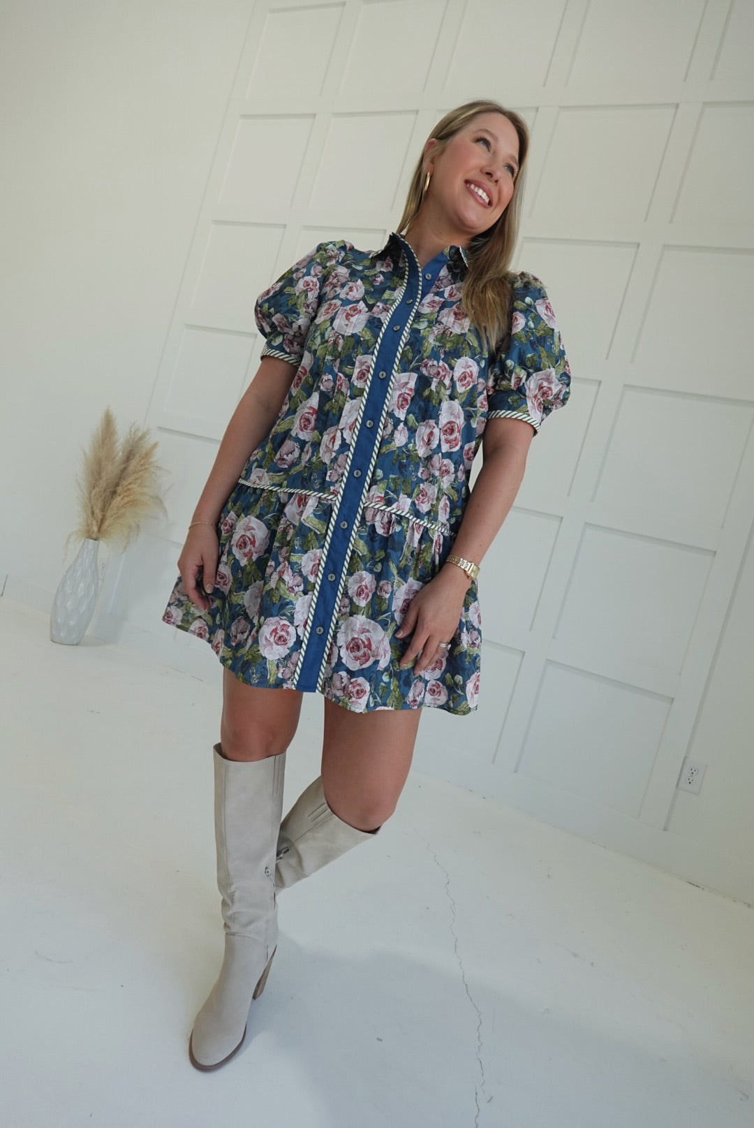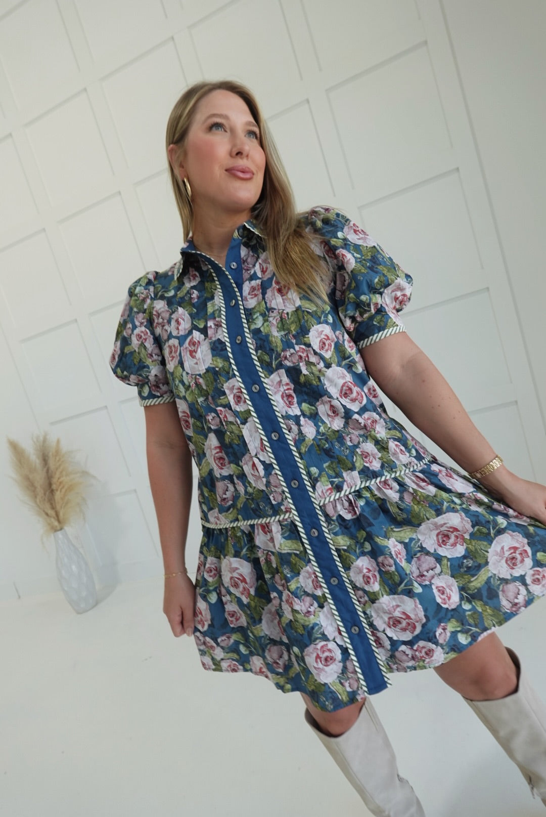 The Forsyth Mini Dress in teal combines a charming floral print with delicate short puff sleeves for a feminine look. Its contrast stripe binding trim and button-front closure add subtle style details. Designed with a side pocket and a lightweight, non-sheer woven fabric, this lined dress ensures comfort and practicality. Perfect for warm days, it offers ease of movement while keeping you confidently stylish.