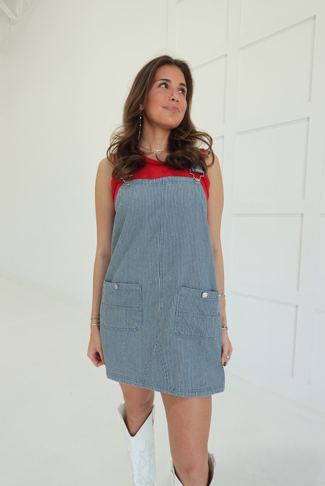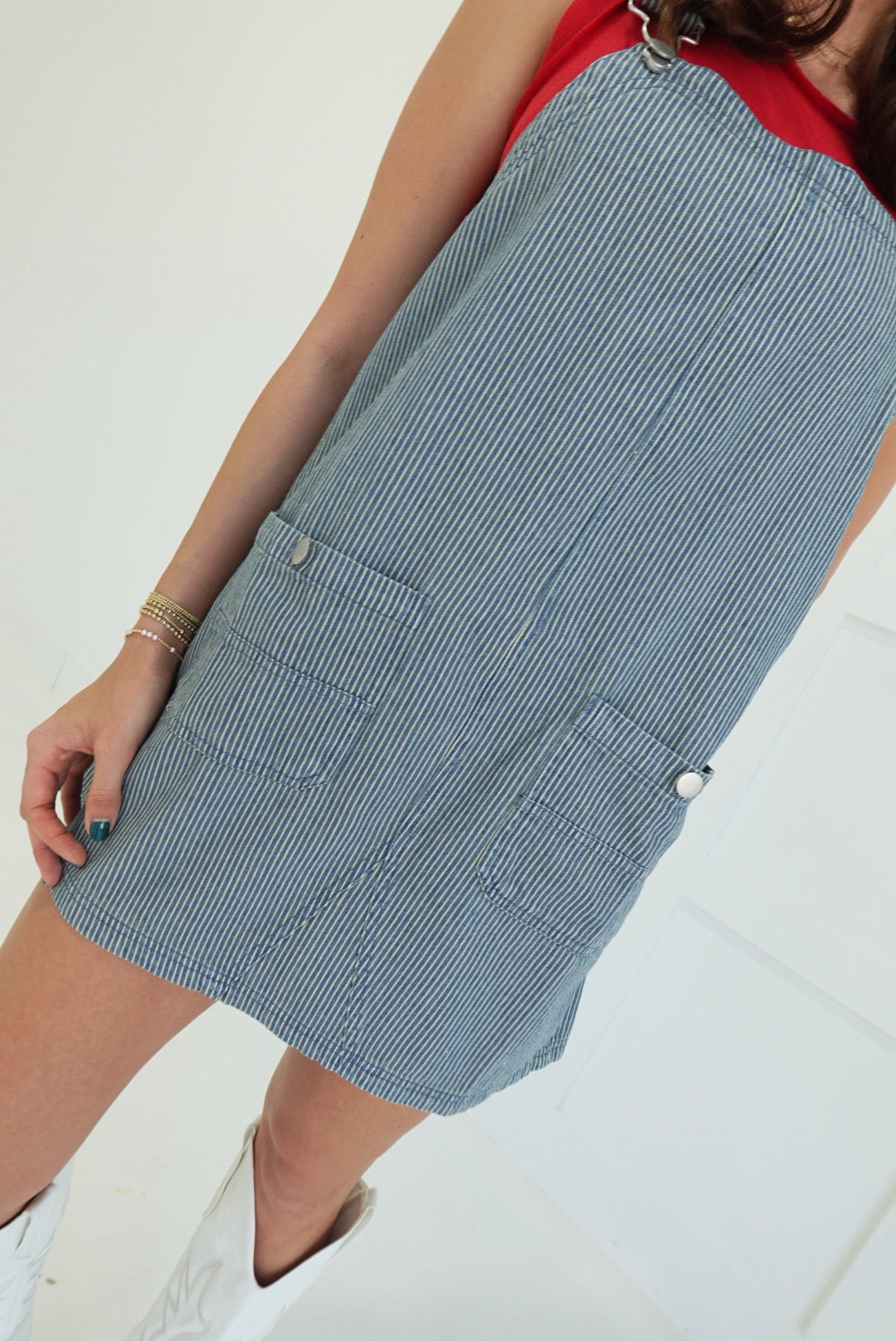 The Franco Overall Dress strips away convention with bold vertical stripes that command attention. This mini silhouette channels vintage workwear with an unapologetic edge—adjustable straps, functional pockets, and a daring hemline make it perfect for those ready to turn heads. Pair it with combat boots for an edgy vibe or dress it up with heels for unexpected sophistication. A statement piece that refuses to blend in.
