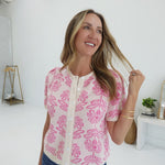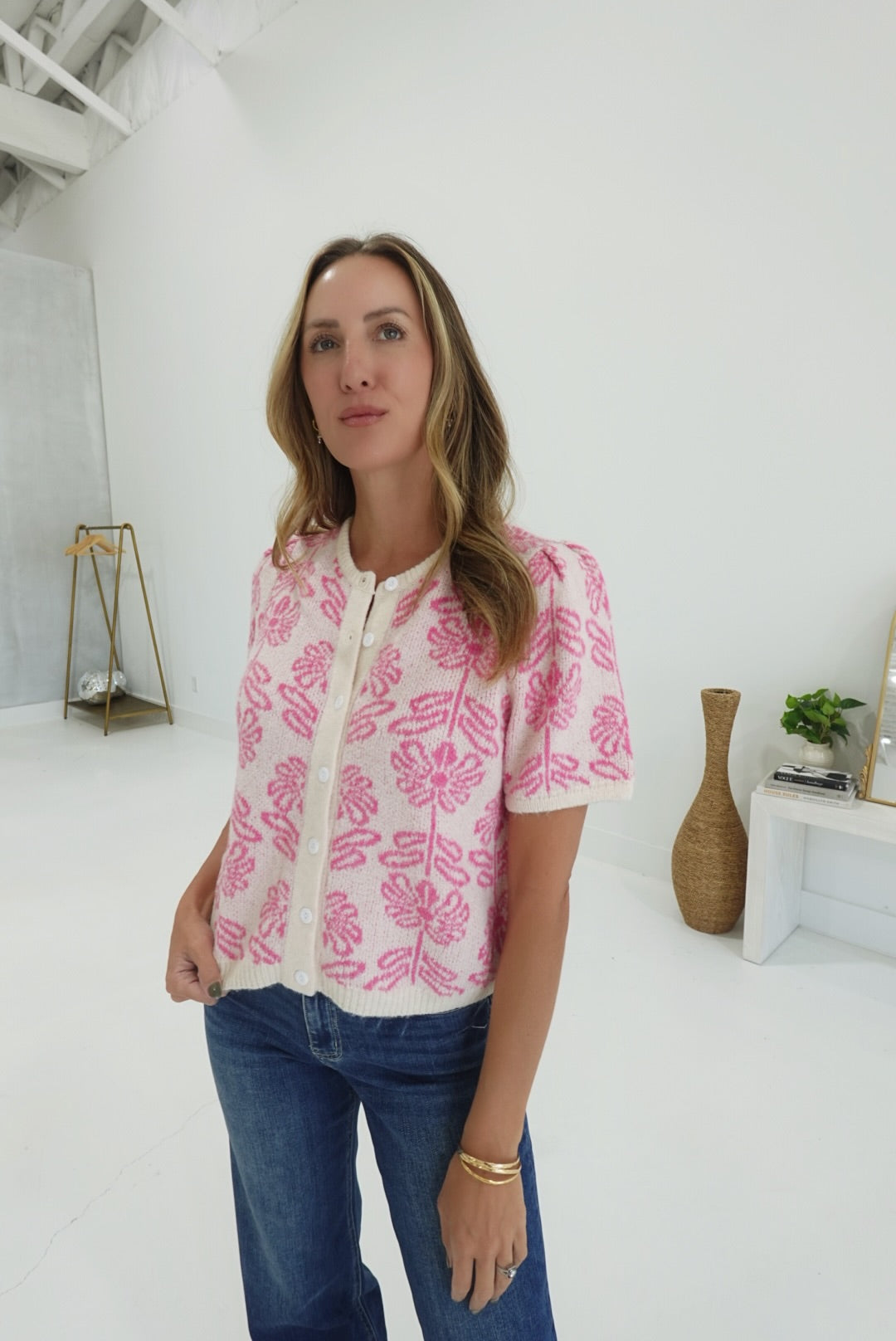 The Franco Sweater Top in pink offers a charming blend of style and comfort with its floral knit pattern and short puff sleeves. This lightweight cardigan adds a delicate, feminine touch to any outfit while keeping you cozy. Its soft fabric and flattering fit make it perfect for layering on cooler days, giving you both warmth and effortless elegance.