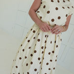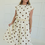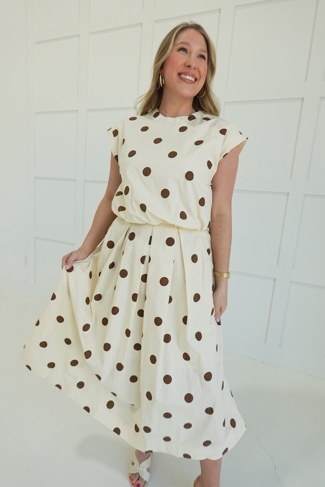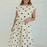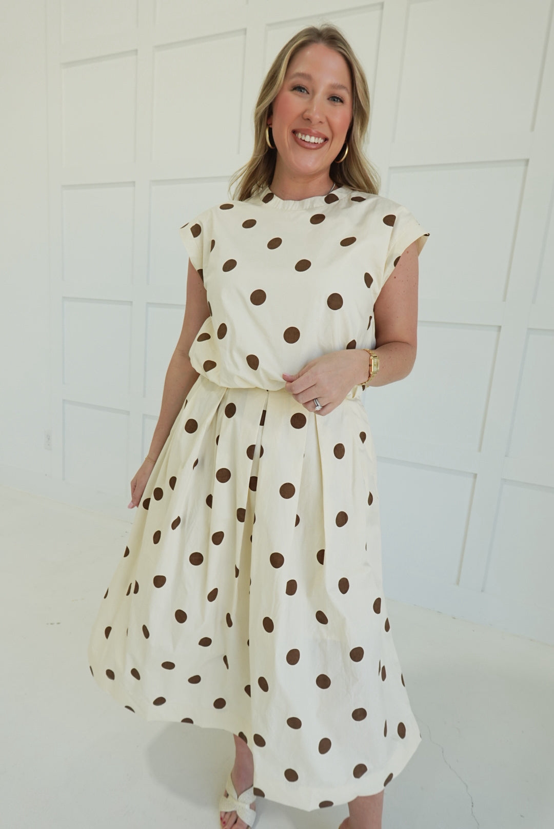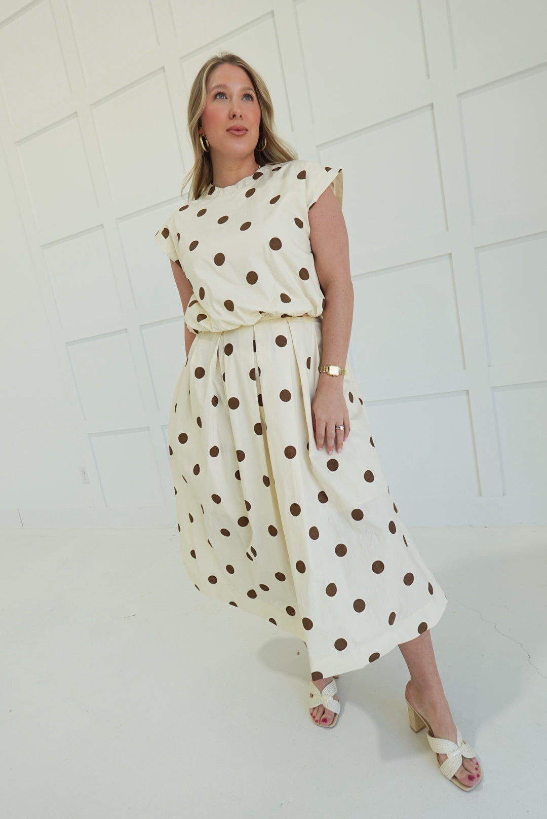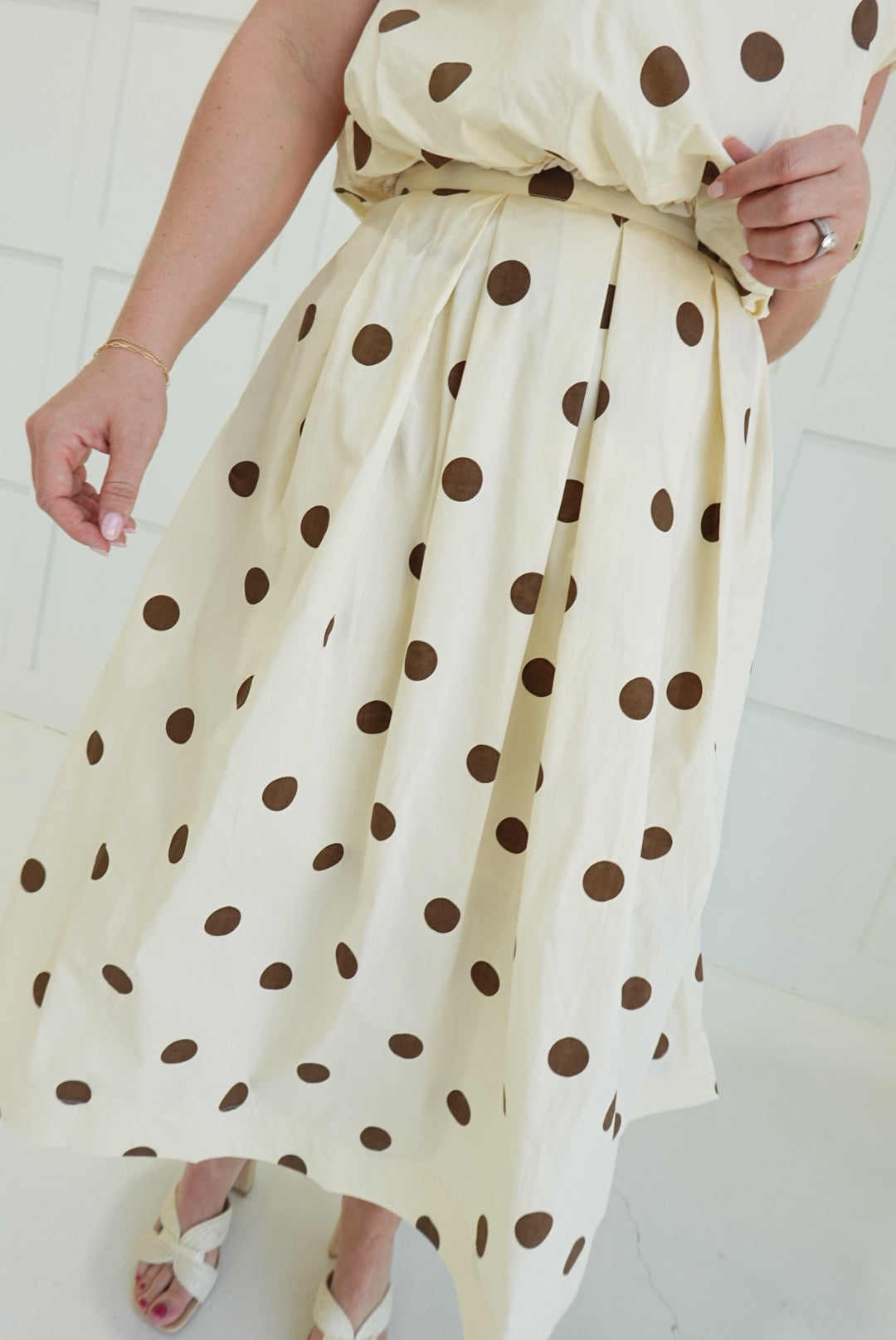 Embrace bold style with this striking two-piece set featuring a pleated midi skirt paired with a bubble crop top. The round neckband crop delivers a daring silhouette, while the polka dot pattern adds playful sophistication. Perfect for those ready to make a statement—dress it up for nights out or keep it casual for confident everyday wear. The structured pleats create elegant movement, while the cropped top balances the midi length for a modern, fashion-forward look.