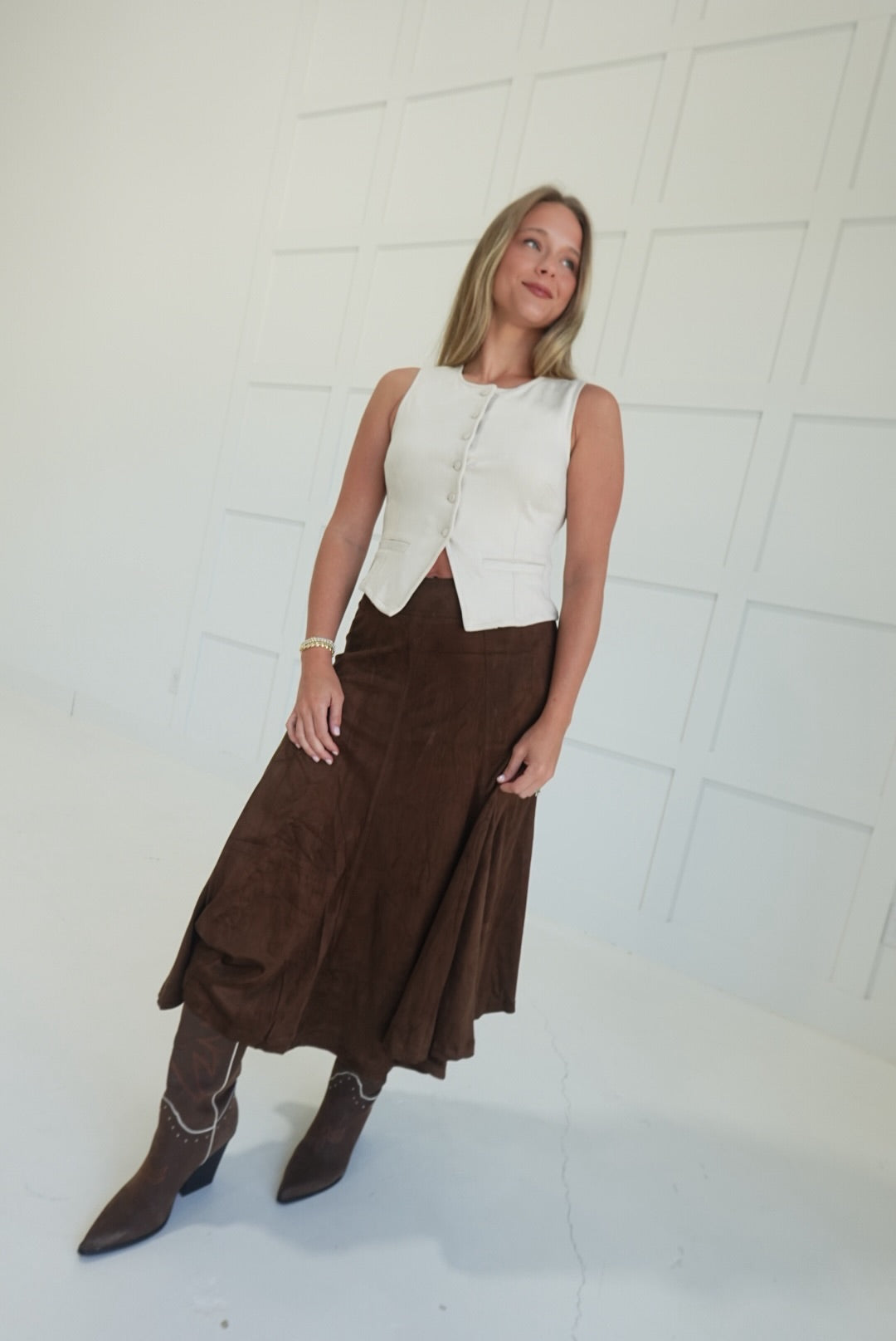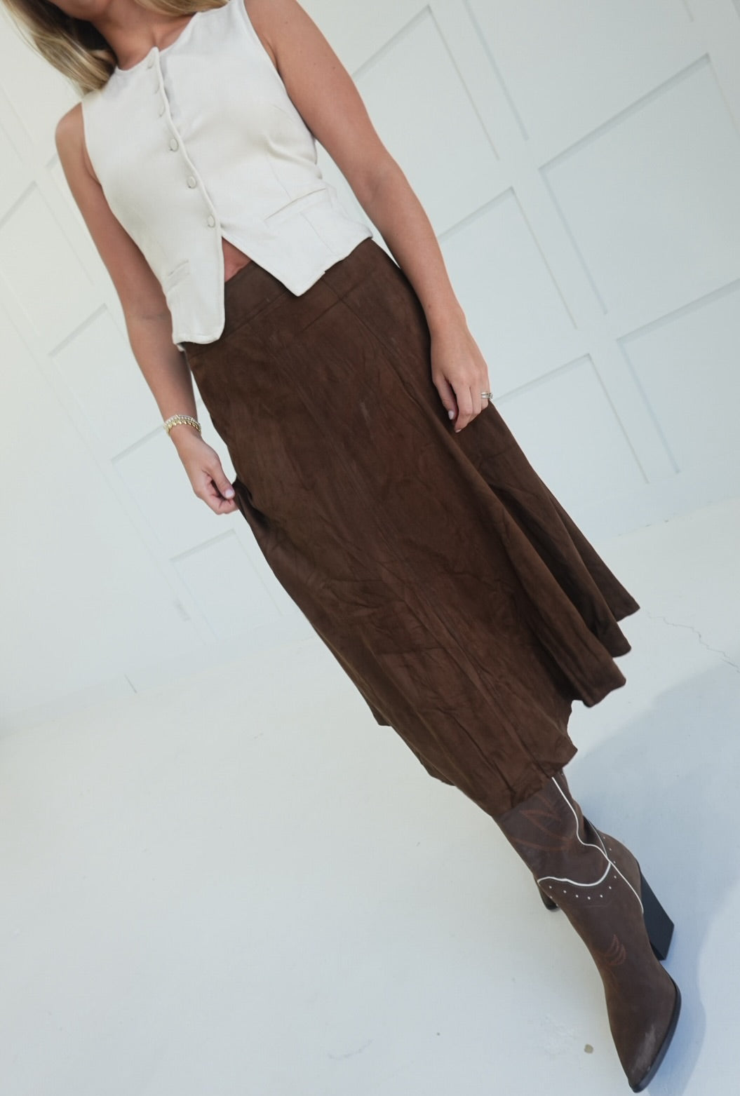 Embrace timeless style with the Frontier Chic Midi Skirt, crafted from soft suede that adds a touch of luxury to your wardrobe. Its flattering flare silhouette enhances movement and comfort, making it perfect for both casual outings and special occasions. This midi-length skirt pairs effortlessly with your favorite tops, helping you create versatile looks that feel confident and polished all day long.