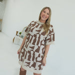 This short sleeve Gatson Sweater Dress features a stylish geometric print, combining comfort with a modern edge. Its soft knit fabric drapes effortlessly for a flattering fit, making it perfect for both casual outings and cozy indoor days. Embrace a chic look that supports your confidence and comfort all day long.