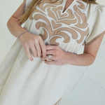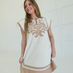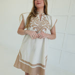 The Genevieve Mini Dress brings effortless elegance to your warm-weather wardrobe. Crafted from breathable linen, this V-neck style features thoughtfully placed contrasting and embroidered appliqué details that add visual interest and personality. The fully lined construction ensures comfort and confidence with every wear. Perfect for casual outings, garden parties, or relaxed evenings out, this dress combines timeless sophistication with modern flair. A versatile piece that works beautifully on its own or layered with your favorite accessories.