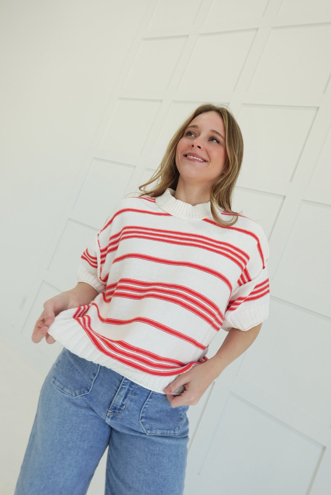 The Golden Days Sweater commands attention with its bold color blocking—crisp white paired with coral that refuses to blend in. This crew neck short sleeve design strips away excess, delivering pure style with zero apologies. Perfect for layering over basics or standing solo, it's the kind of piece that makes a statement without shouting. Crafted for those who know exactly what they want and aren't afraid to wear it.