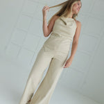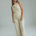 Elevate your wardrobe with the Good Impression Set, featuring a halter cowl neck top paired with A-line hem pants. The gold button accents and front pocket details add a refined touch, making this set both chic and sophisticated. Perfect for making a confident, stylish statement at any occasion.
