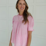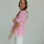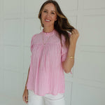 Get ready to rock the gingham trend with our Gracie Gingham Top in Pink! This playful top features a high neckline and trendy short puff sleeves for a fun and stylish look. Perfect for pairing with your favorite jeans or skirts, this top is a must-have addition to your wardrobe.