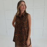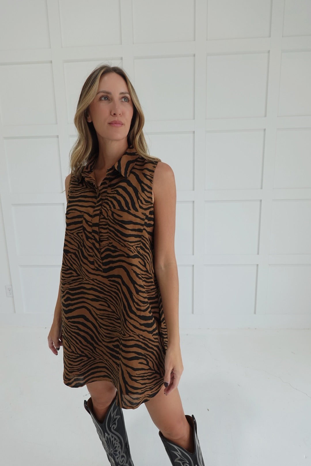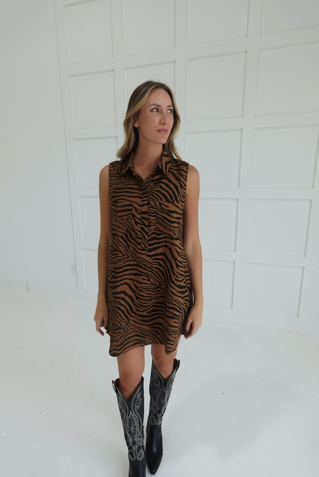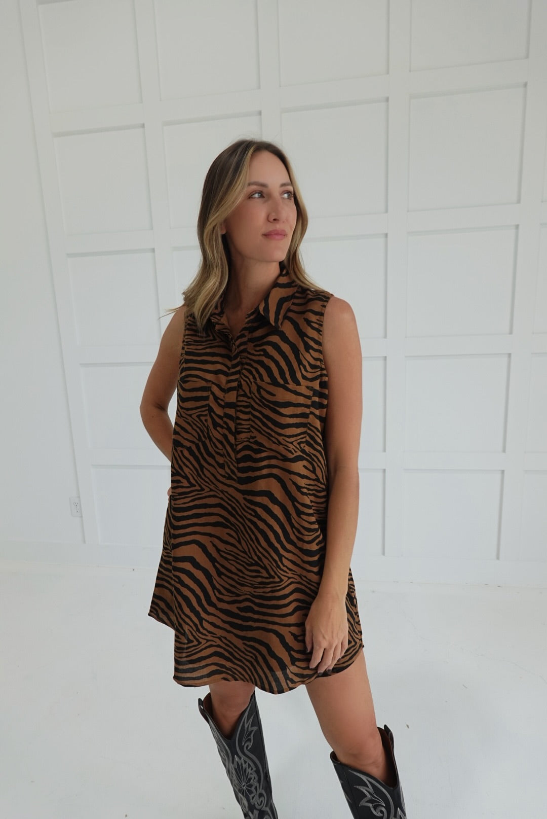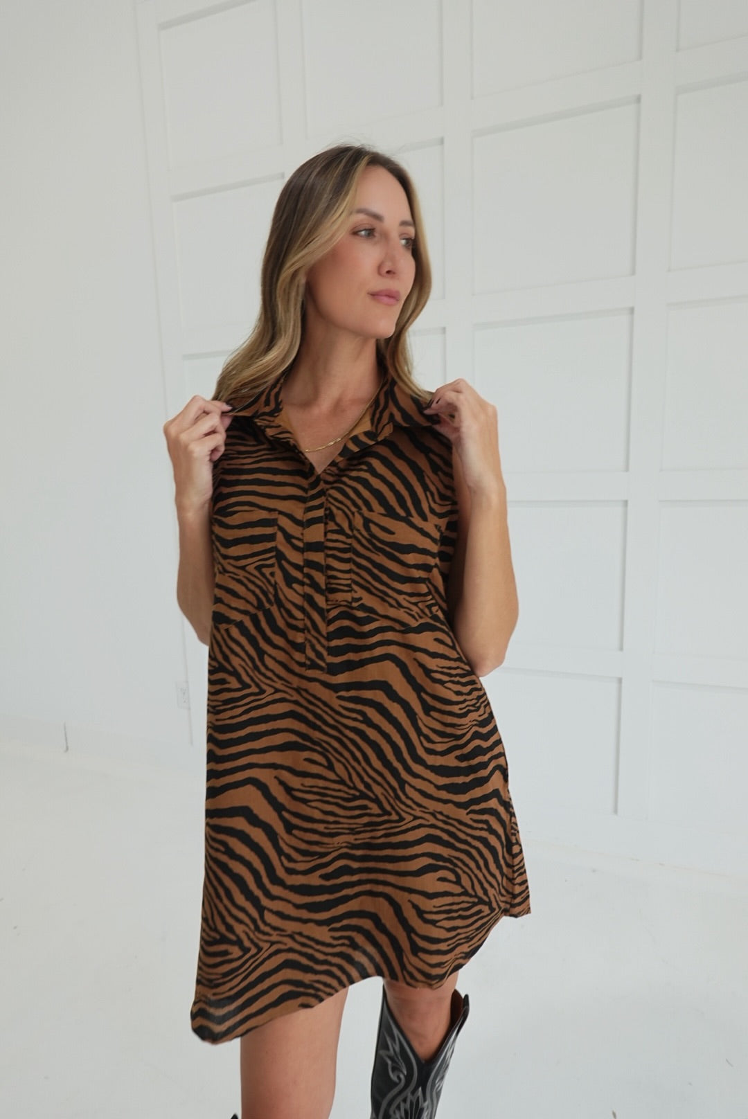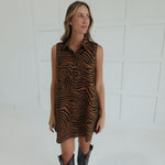 Embrace bold style and effortless comfort with the Greater Tiger Stripe Dress. This button-down shirt dress features a striking tiger print and practical pockets, perfect for keeping essentials close. Its relaxed fit and classic collar make it an easy choice for day-to-night wear, helping you feel confident and ready for any occasion.