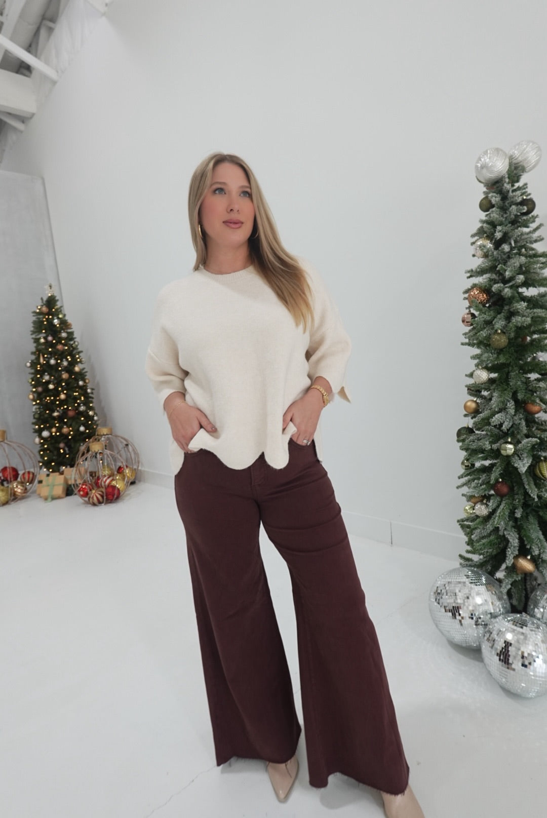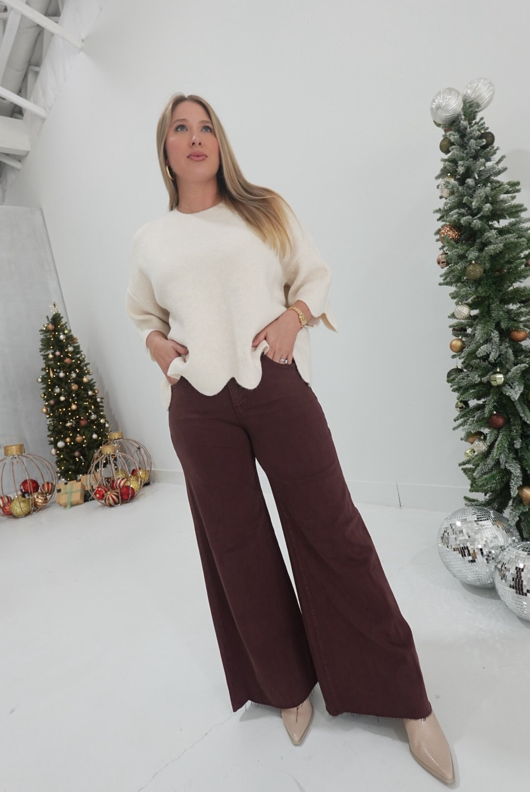 - Scalloped Hem Sweater With 3/4 Length Sleeves