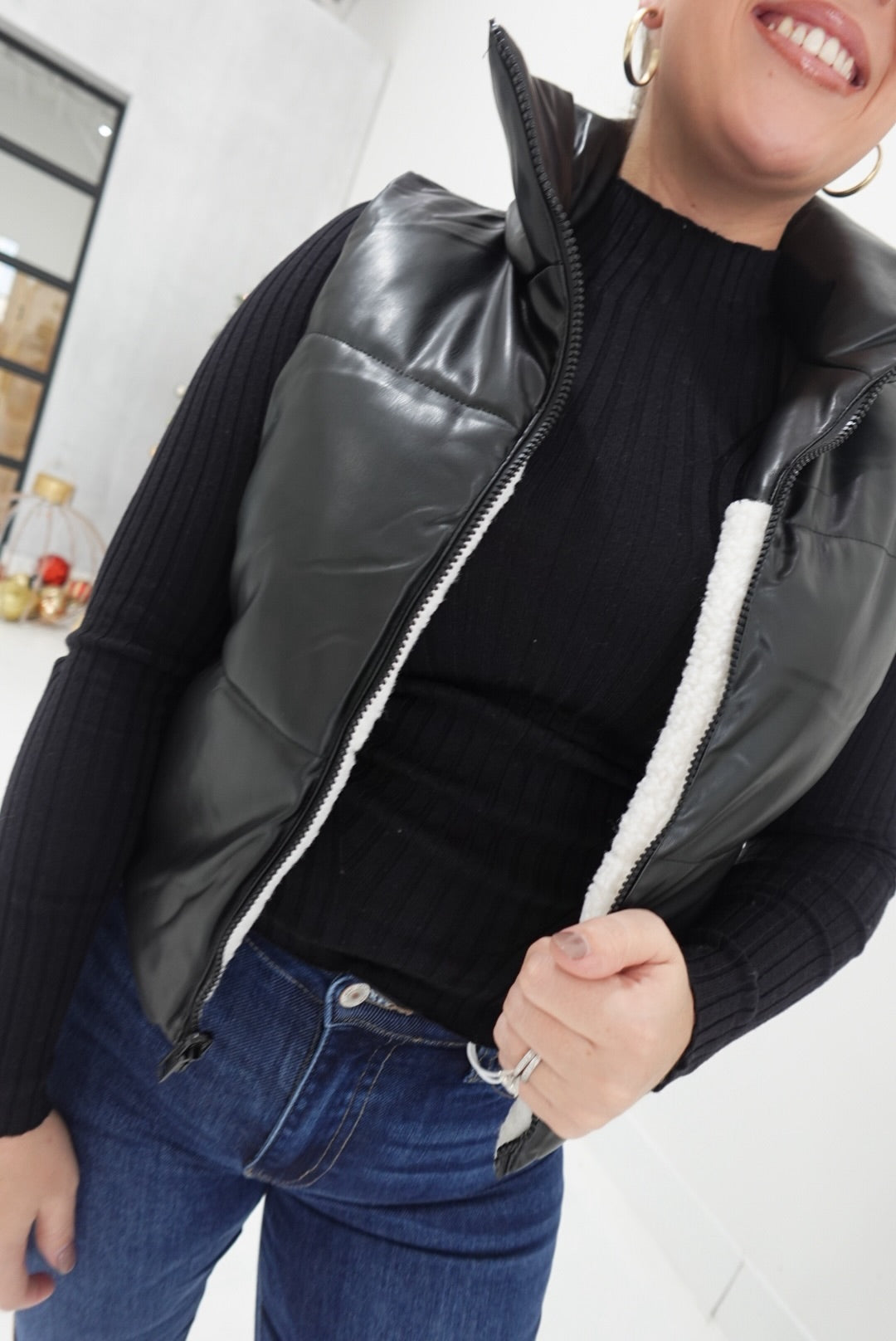Stay warm and stylish with the Half In Vest in Black. This reversible design features faux leather on one side and cozy sherpa contrast padding on the other, giving you two versatile looks in one. Its cropped fit offers modern comfort and layering ease, making it a perfect choice for unpredictable weather. Whether you want a sleek or snug option, this vest supports your style and comfort needs effortlessly.