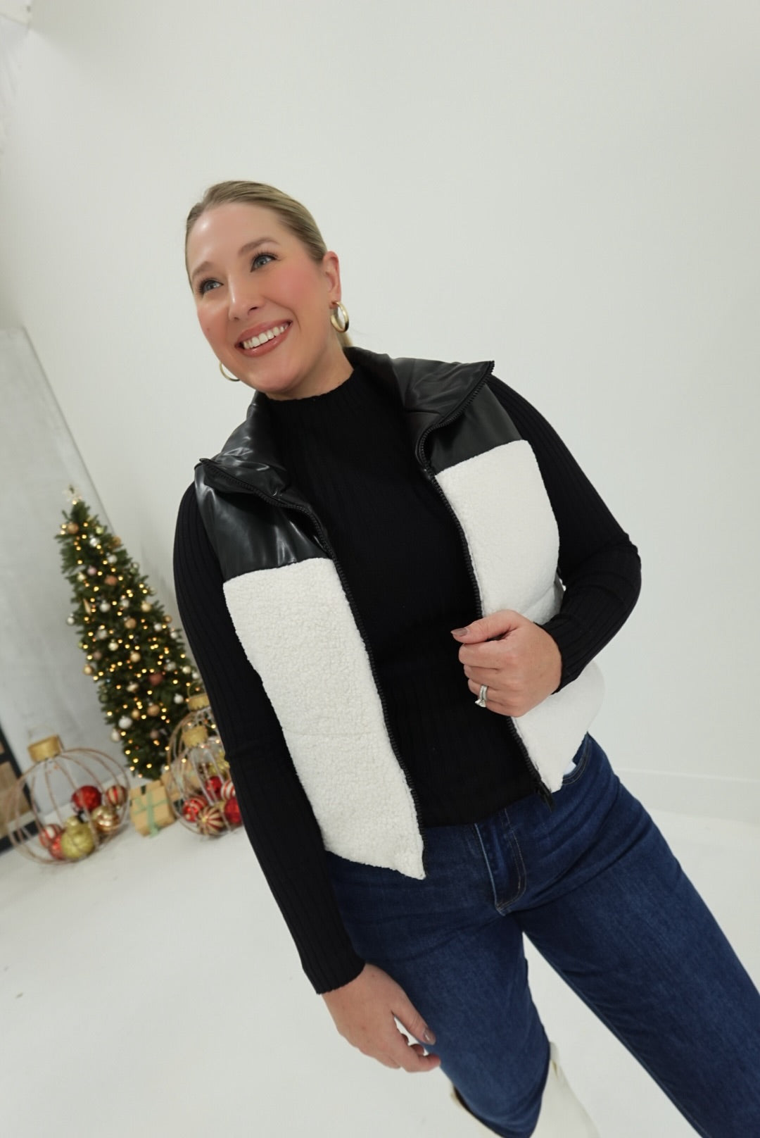 - Faux Leather-Sherpa Contrast Padding Cropped Vest