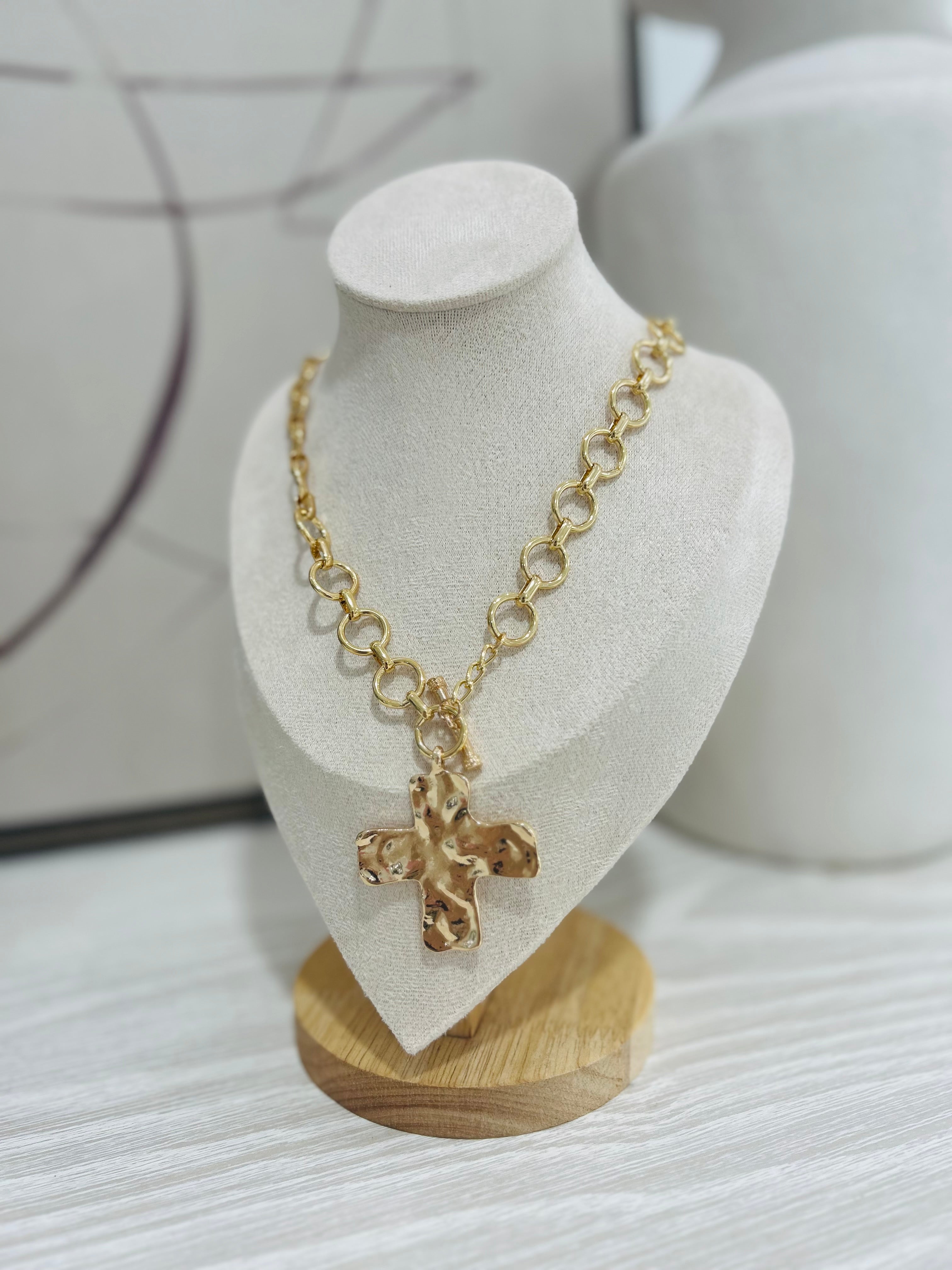 Striking geometric lines meet artisanal craftsmanship in this bold hammered cross necklace. The textured front toggle closure adds an unexpected design element that commands attention, while the substantial pendant makes a fearless statement. Perfect for layering or wearing solo, this piece channels understated edge with refined execution. A versatile essential for those who refuse to blend in.