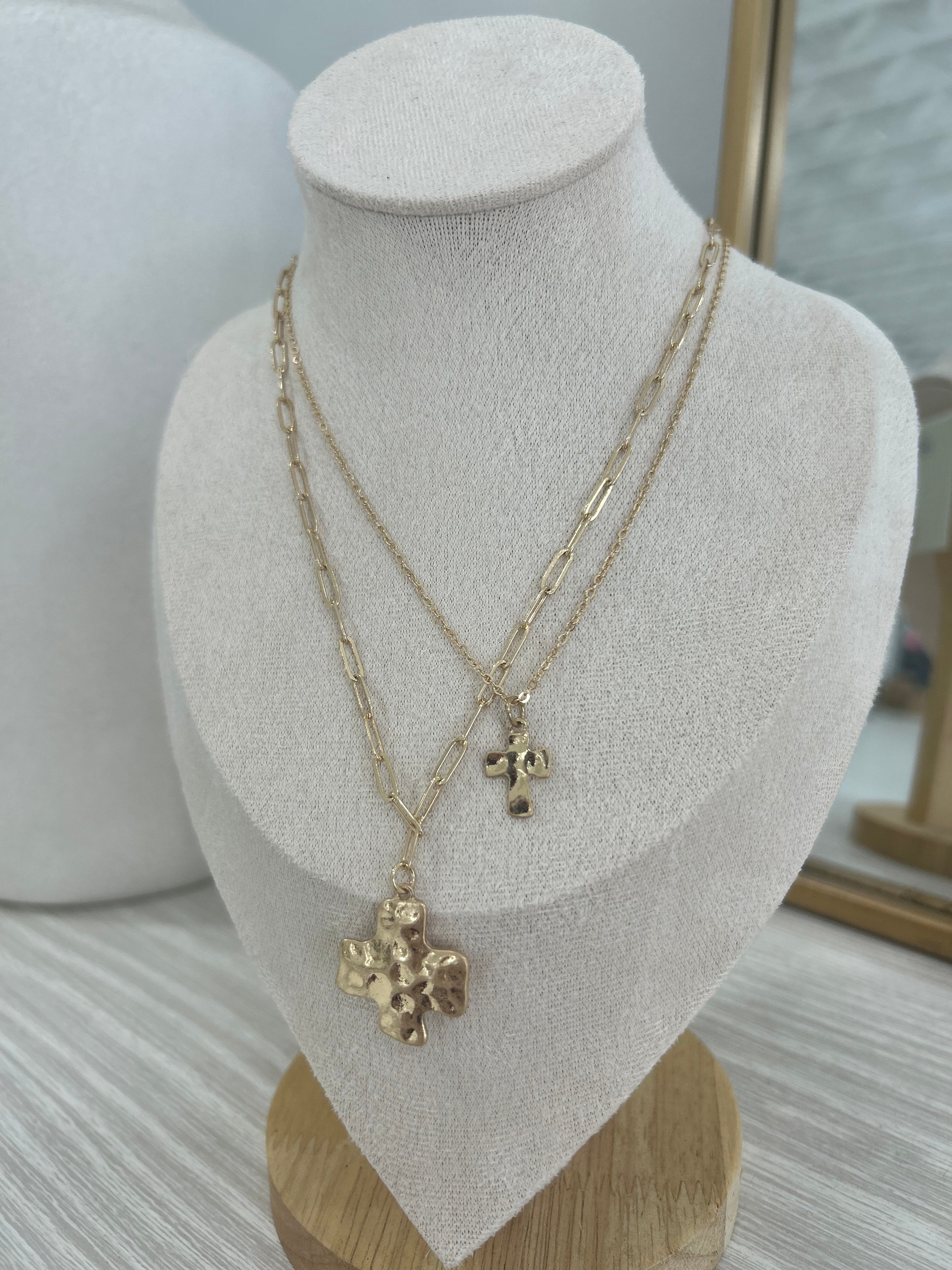 This striking double-layered cross necklace commands attention with its bold hammered metal design. Each layer catches light differently, creating dynamic dimension and depth that evolves throughout the day. The textured finish adds an edgy sophistication perfect for those who refuse to blend in. Layer it fearlessly or wear it solo as a statement piece that speaks to your unapologetic style. A daring accessory for the confident and unconventional.