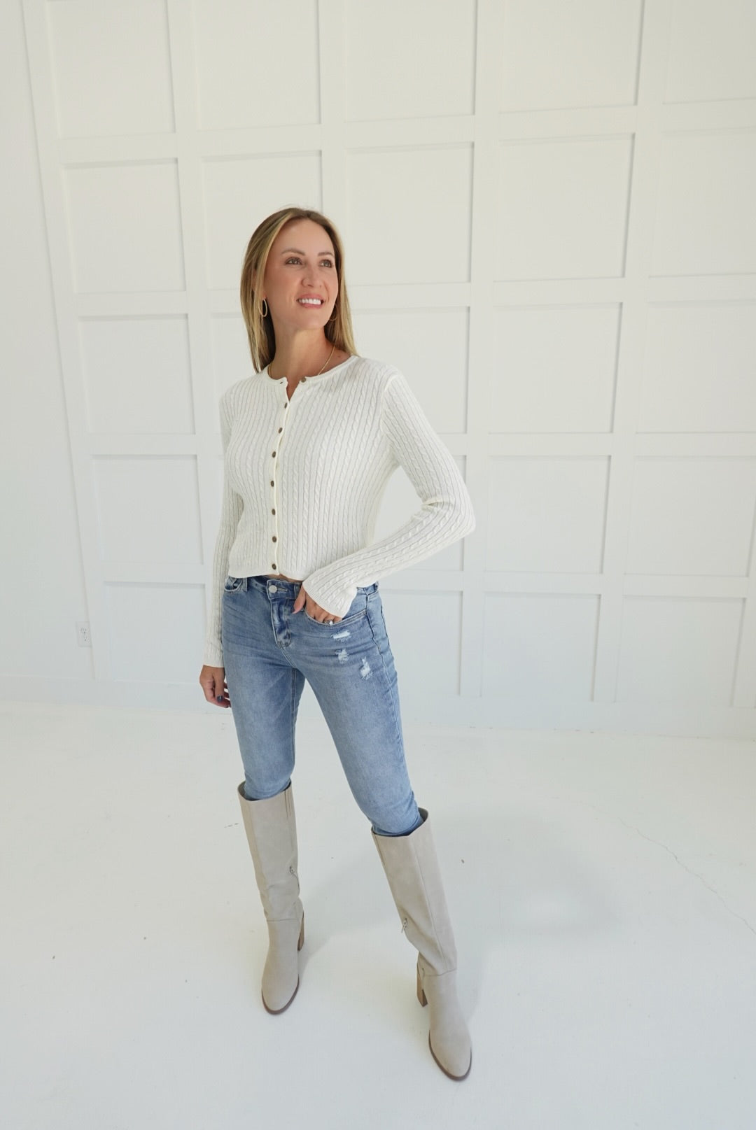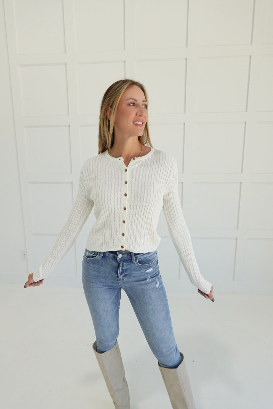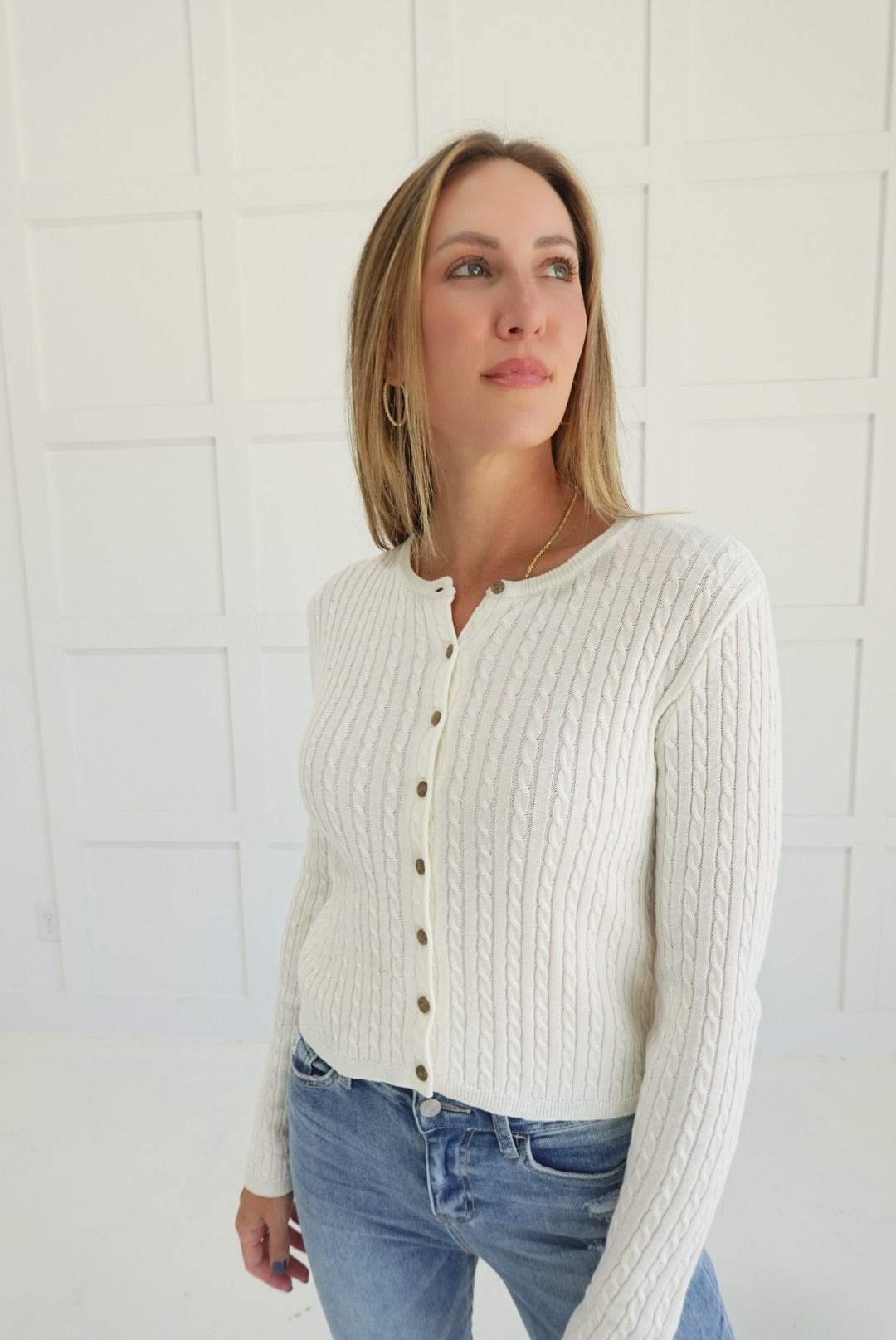 The Harley Cable Knit Cardigan combines classic style with a flattering slim fit to keep you looking polished and confident. Its cable knit design and buttoned front add timeless charm, while long sleeves provide cozy comfort. Perfect for layering, this versatile cardigan easily transitions from casual days to dressed-up occasions, helping you feel poised and put together wherever you go.