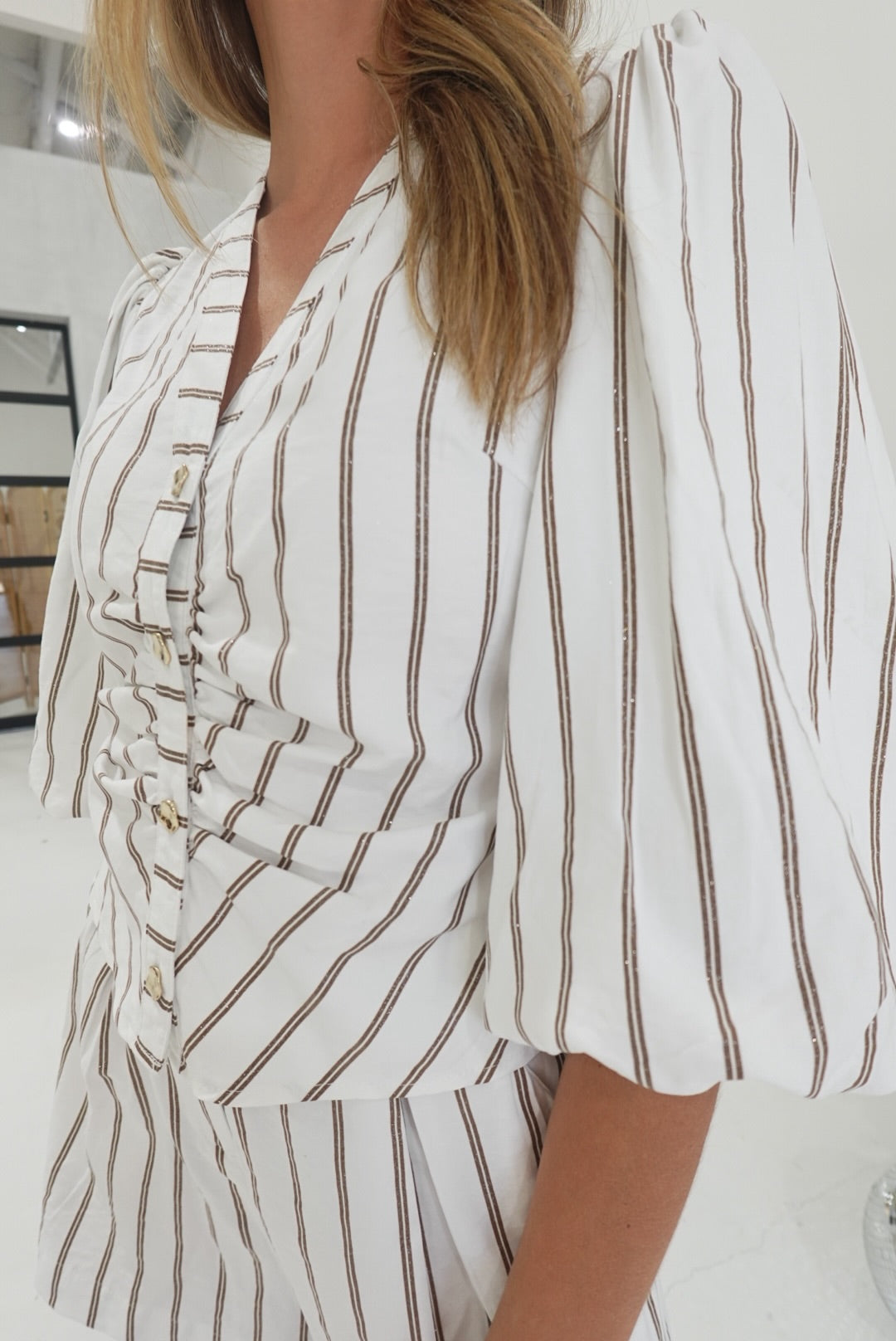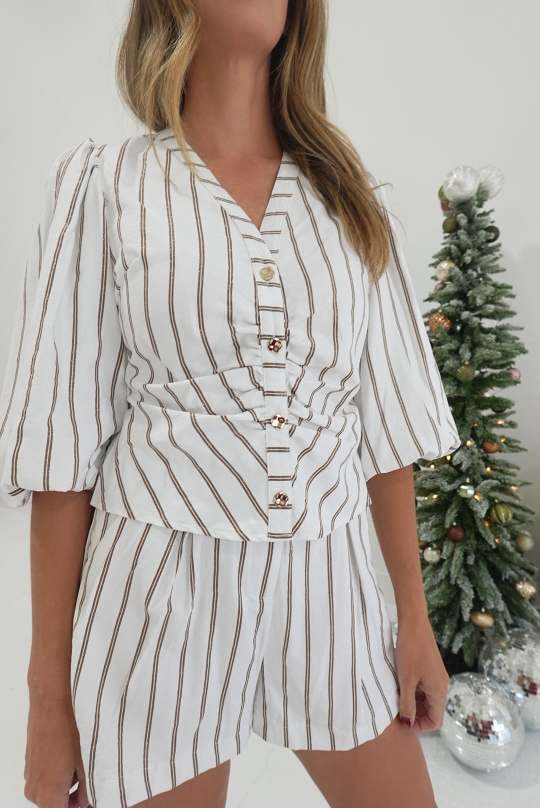 The Harper Striped Short Set brings effortless style to your everyday wardrobe. This charming two-piece features delicate brown metallic stripes against a crisp white background, creating a look that's both polished and approachable. The flattering v-neck and three-quarter sleeves offer comfortable coverage while keeping things fresh and modern. Perfect for casual outings or relaxed weekends, this set pairs beautifully with your favorite sneakers or sandals. You'll love how easy it is to put together a put-together look with this versatile piece.