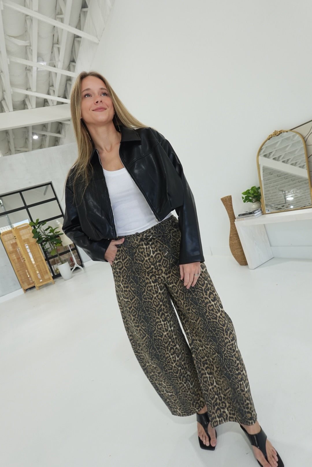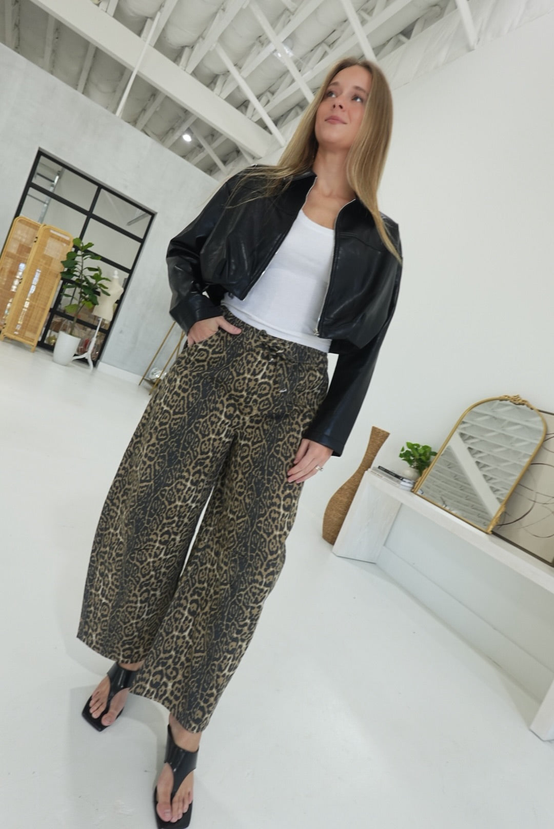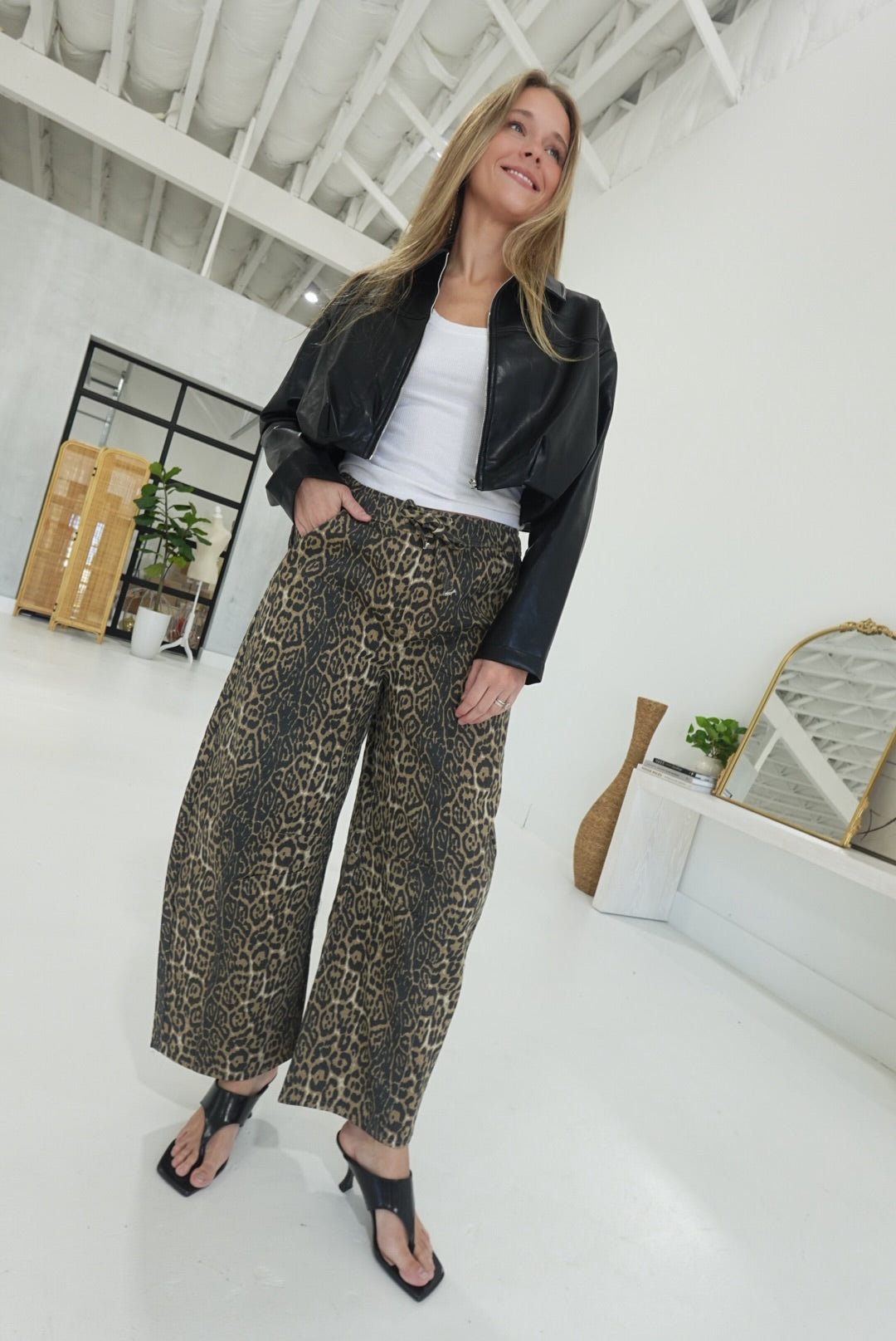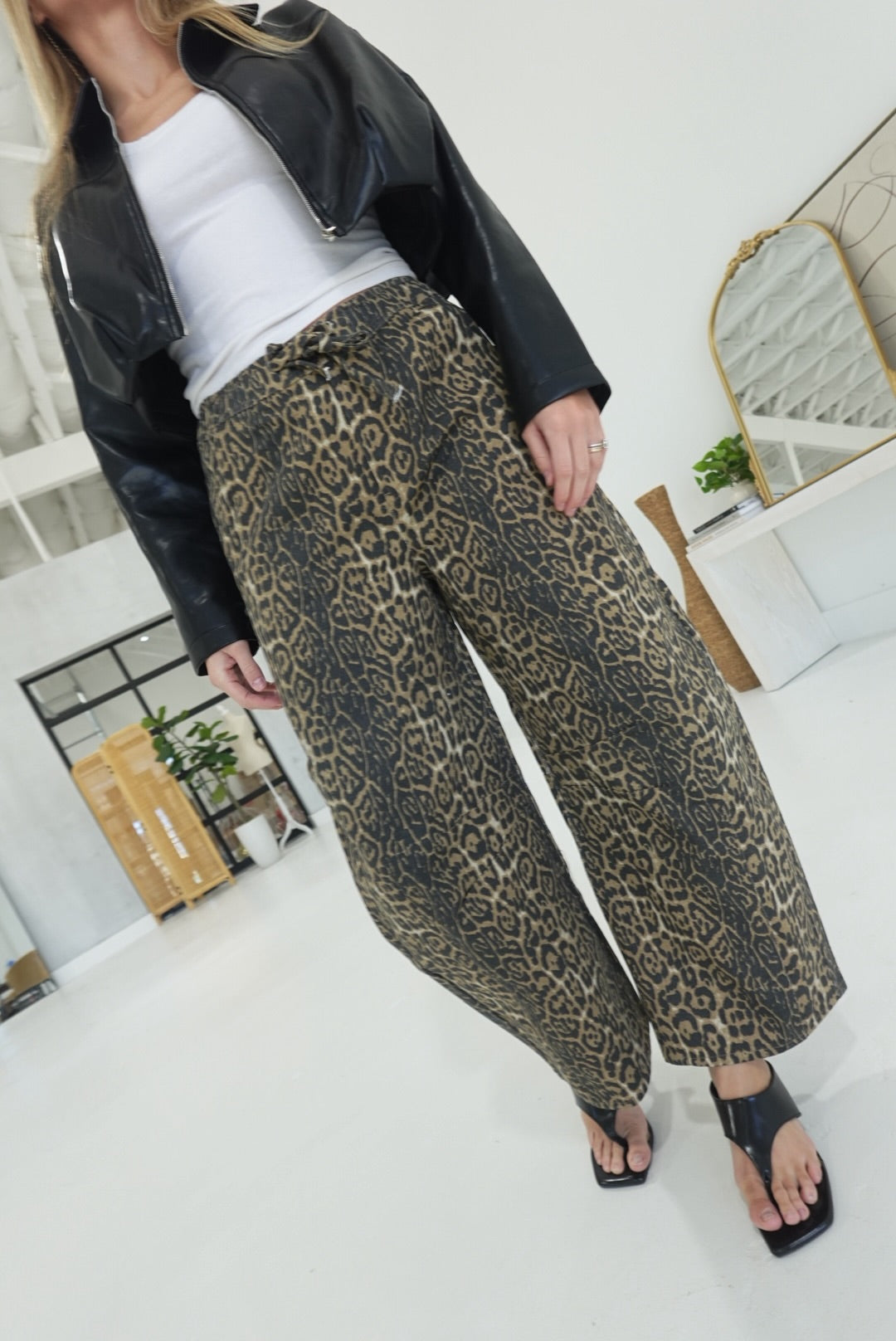 - Leopard Barrel Tie Waist Jeans