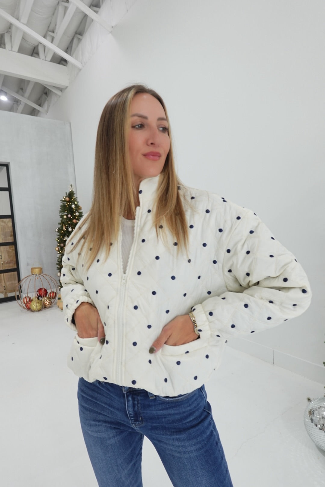 Stay warm and stylish in the Perry Polka Dot Puffer, featuring a cream base with charming navy polka dots. This cozy coat offers reliable insulation to keep you comfortable during chilly days while adding a playful touch to your outerwear collection. Perfect for layering, it blends fun design with practical warmth so you can face colder weather with confidence.