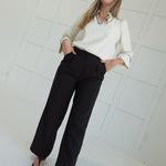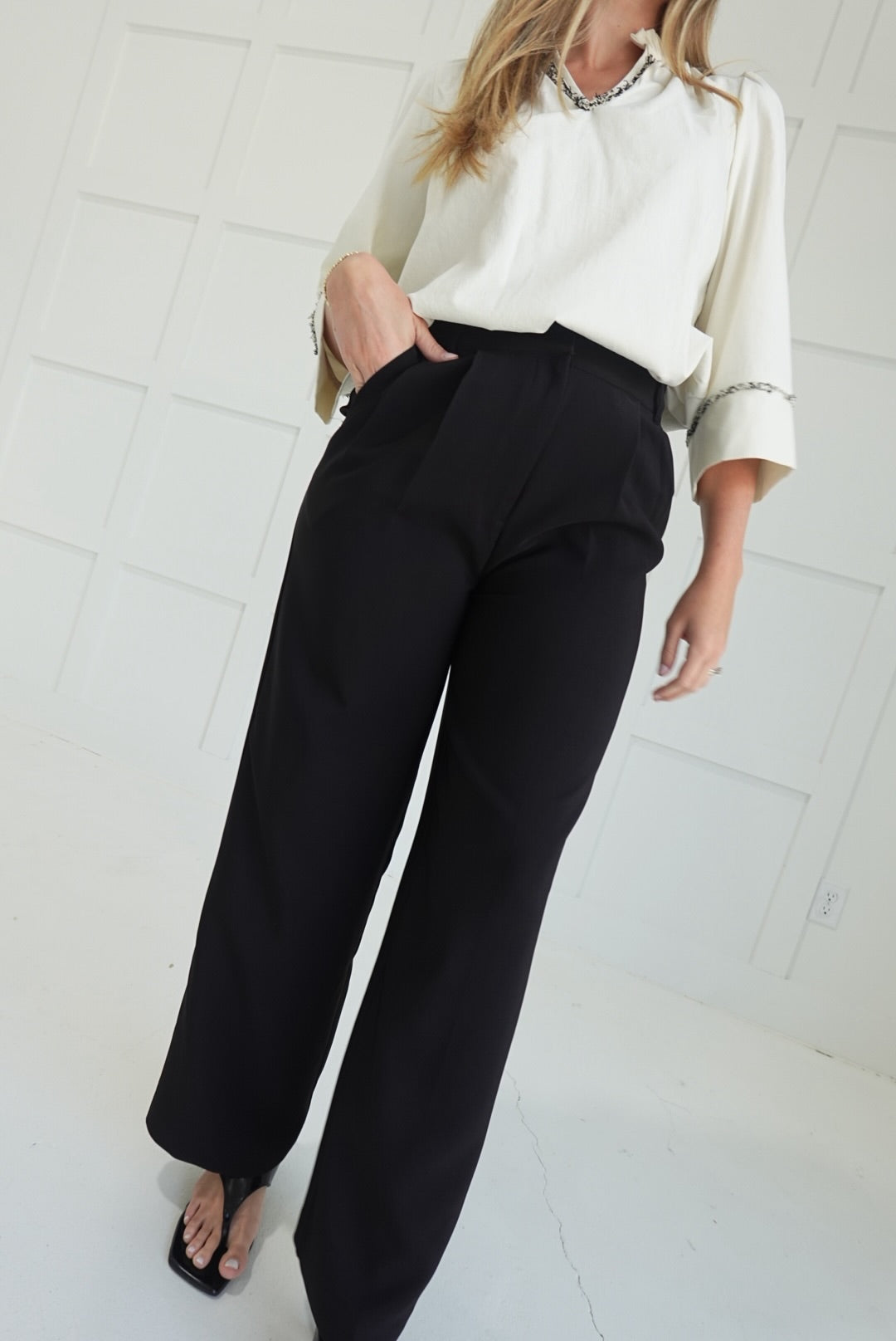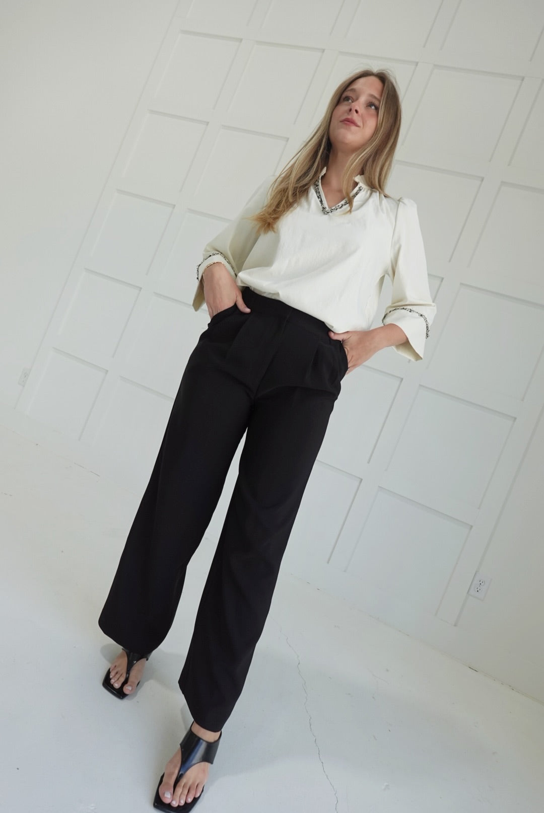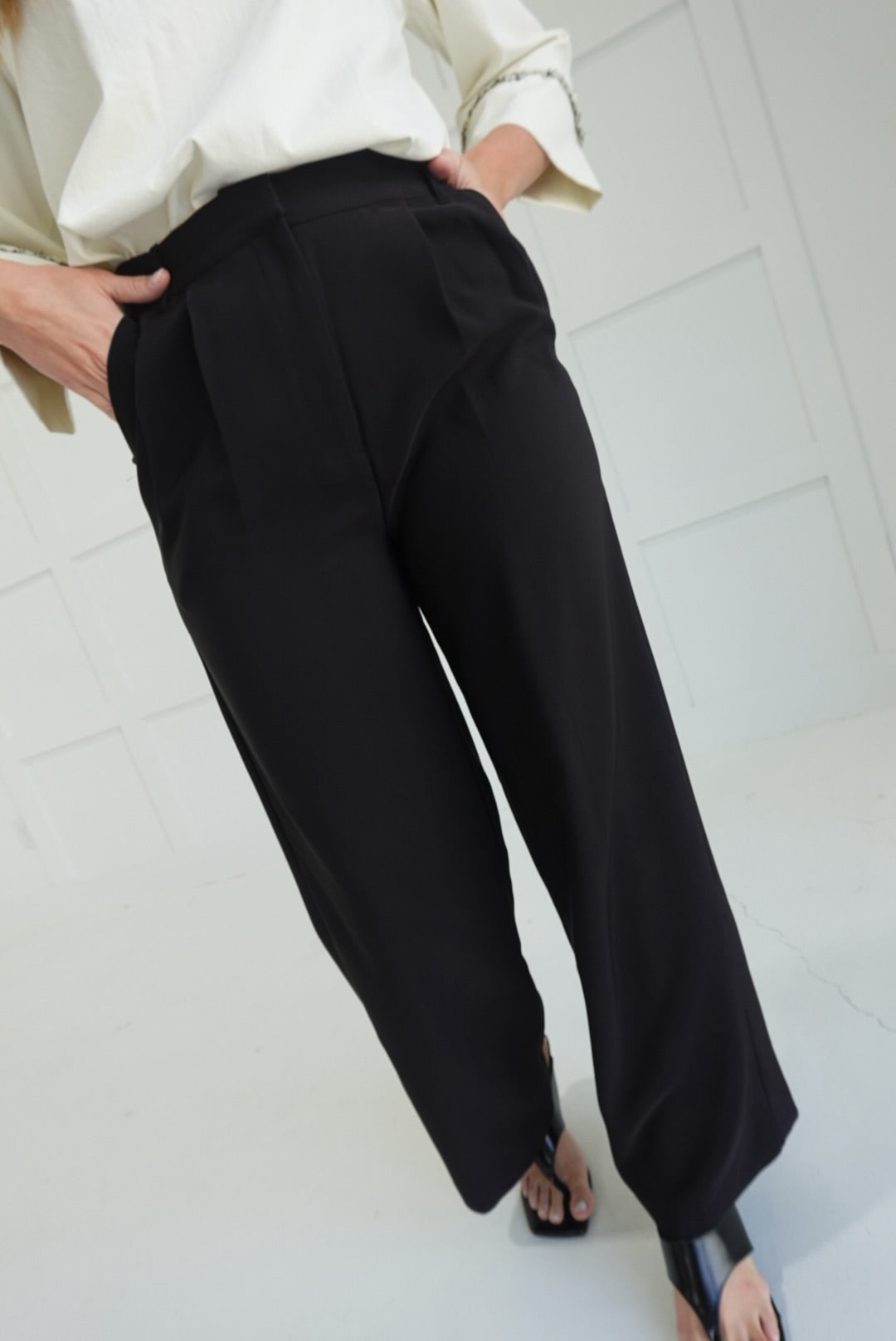 These High Risk Trousers in black combine the comfort of a high waist with the elegant structure of pleated detailing. The wide-leg design offers freedom of movement while maintaining a polished, professional look. Perfect for those seeking stylish versatility, these pants support both confidence and comfort throughout your day.