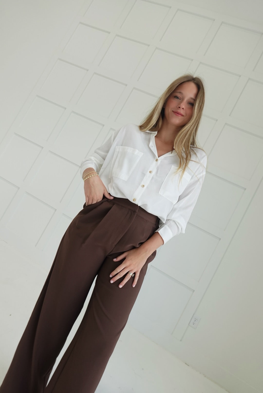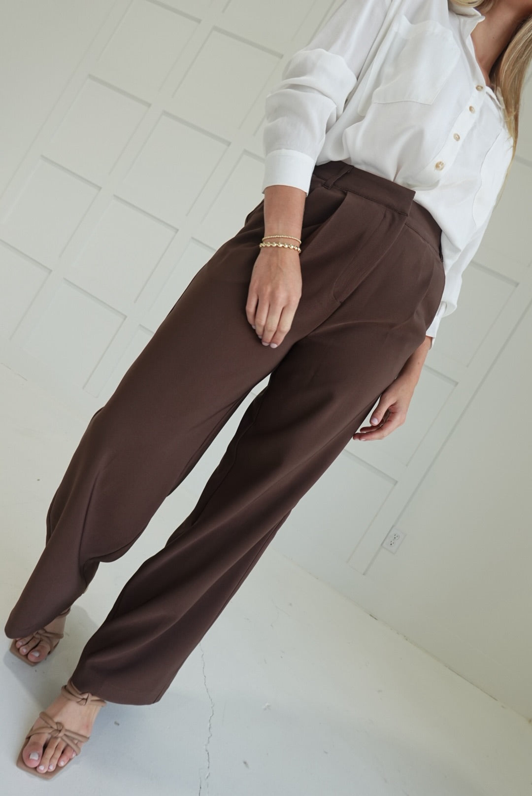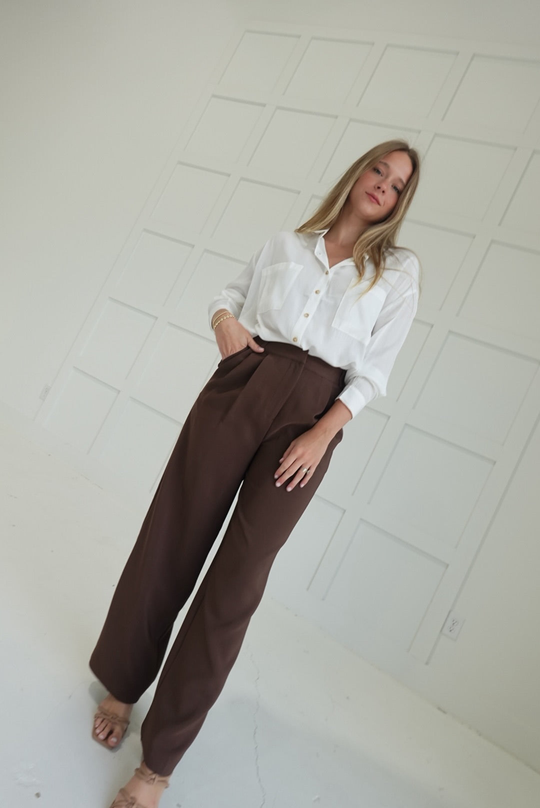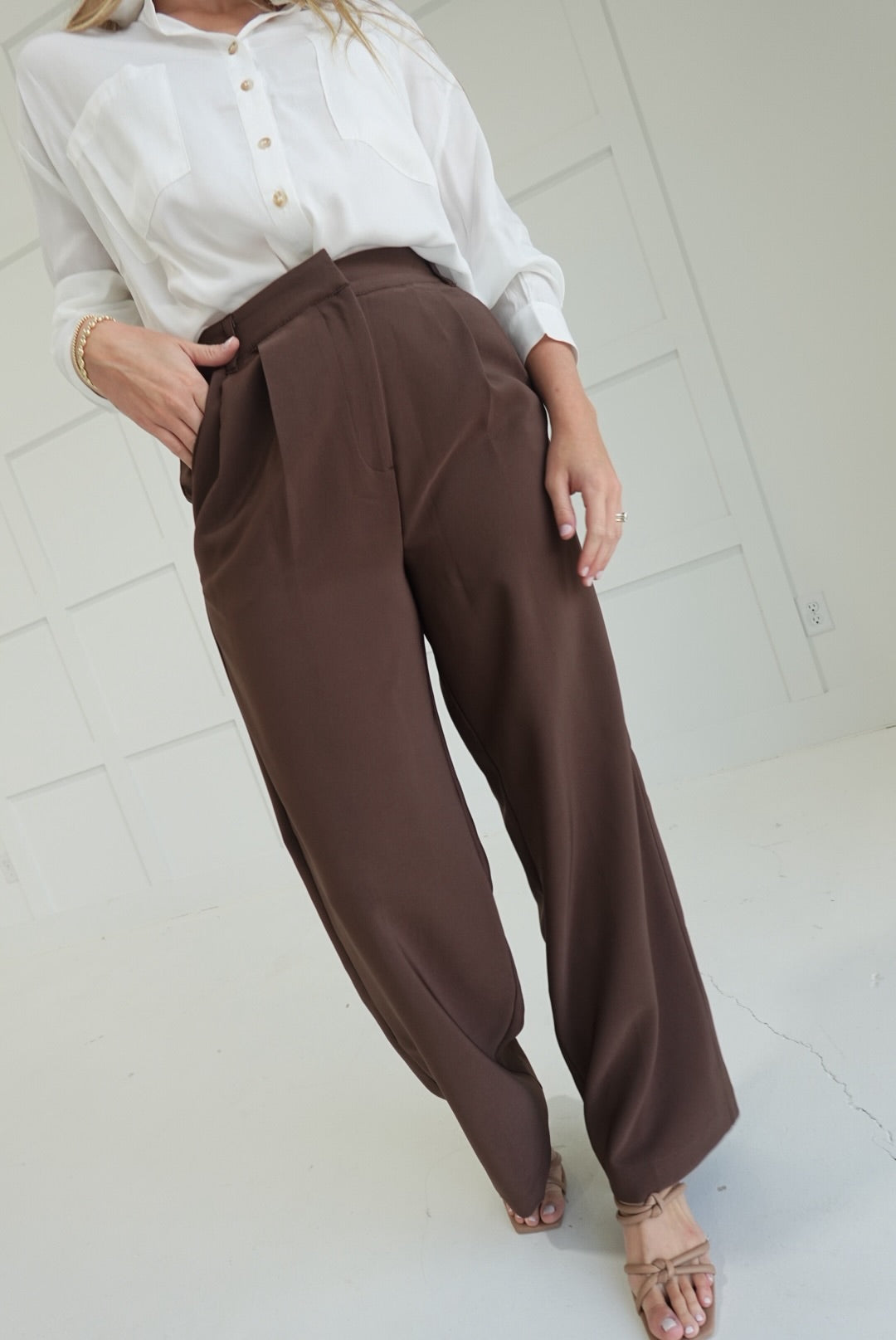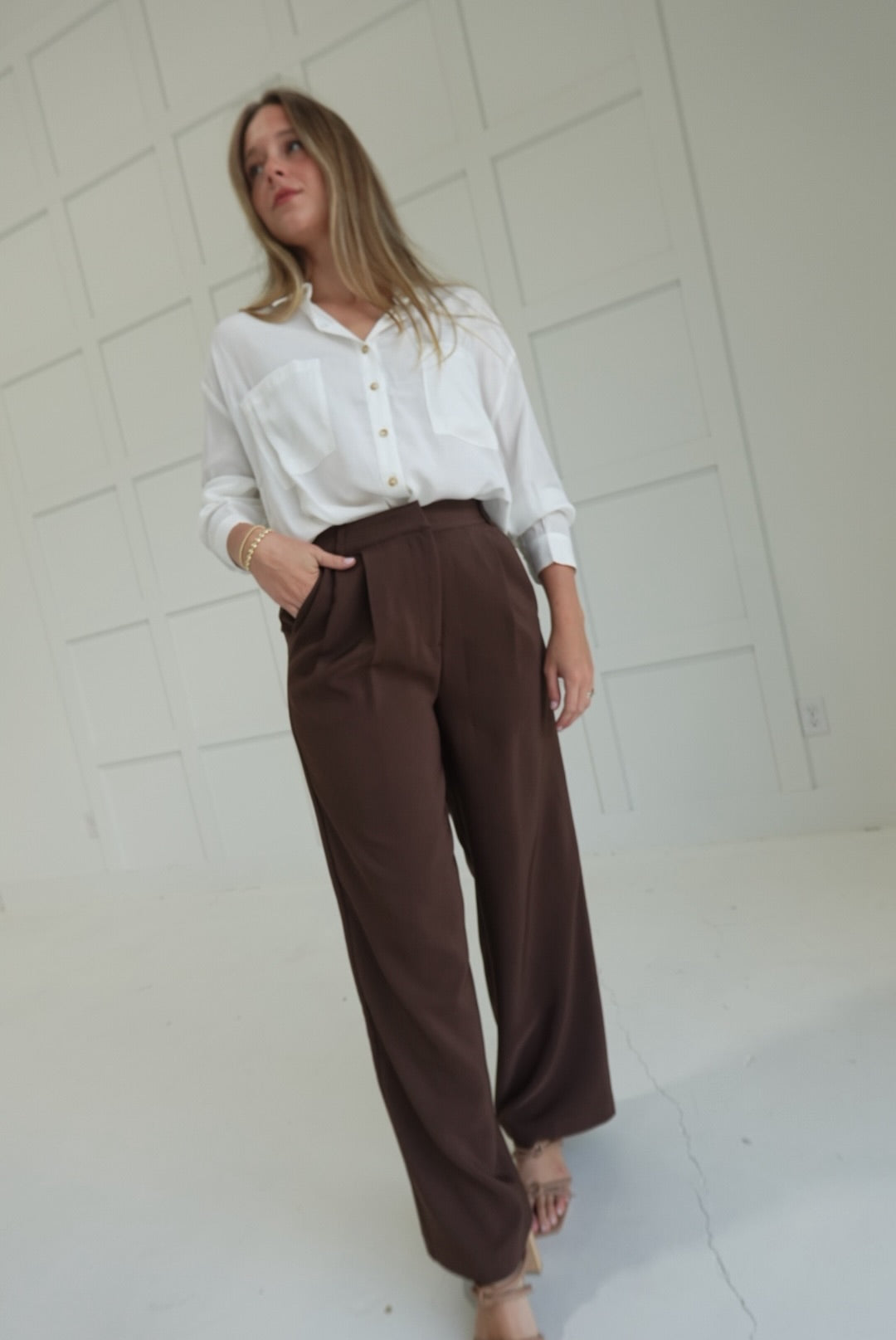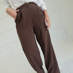 These High Risk Trousers in brown combine the comfort of a high waist with the elegant structure of pleated detailing. The wide-leg design offers freedom of movement while maintaining a polished, professional look. Perfect for those seeking stylish versatility, these pants support both confidence and comfort throughout your day.