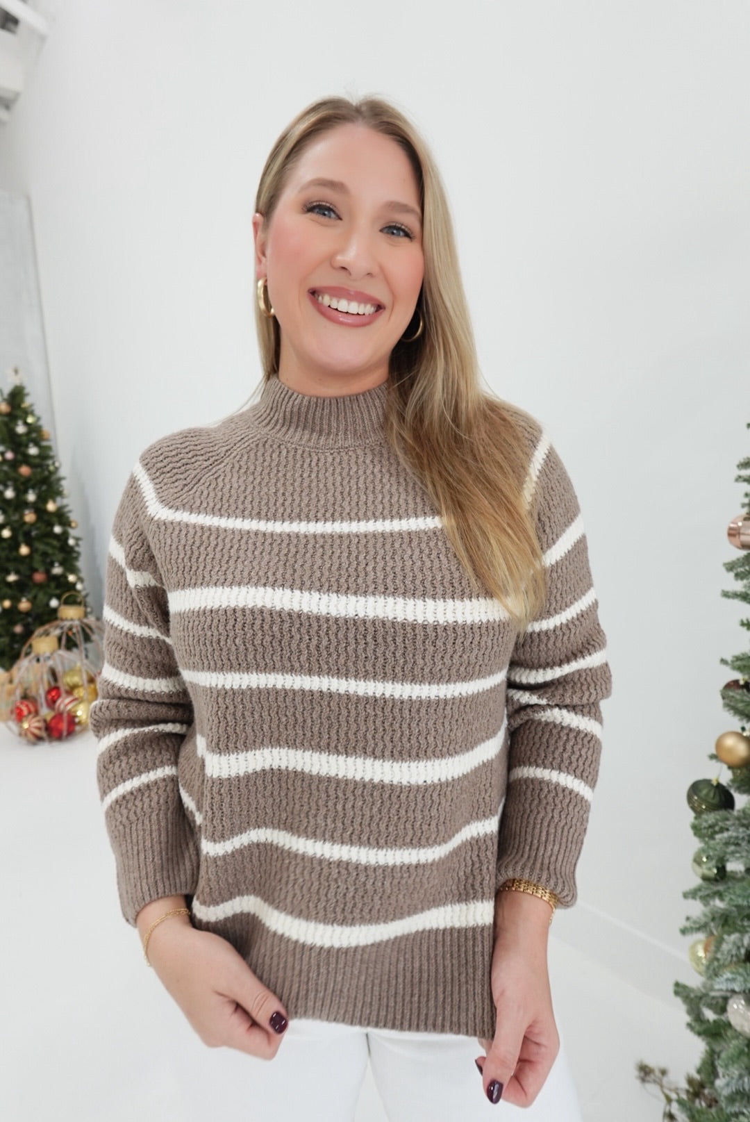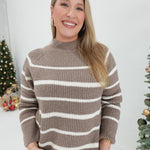 Experience cozy comfort with the Higher Highs Sweater in Taupe. This stripe high neck knit pullover offers warmth and style, featuring a soft, breathable fabric that keeps you comfortable throughout the day. Its high neckline provides extra coverage, perfect for cooler weather or layering. The subtle taupe hue and classic stripes add a timeless touch, making this sweater a versatile addition to your wardrobe. Stay warm and look effortlessly chic with this essential knit pullover.