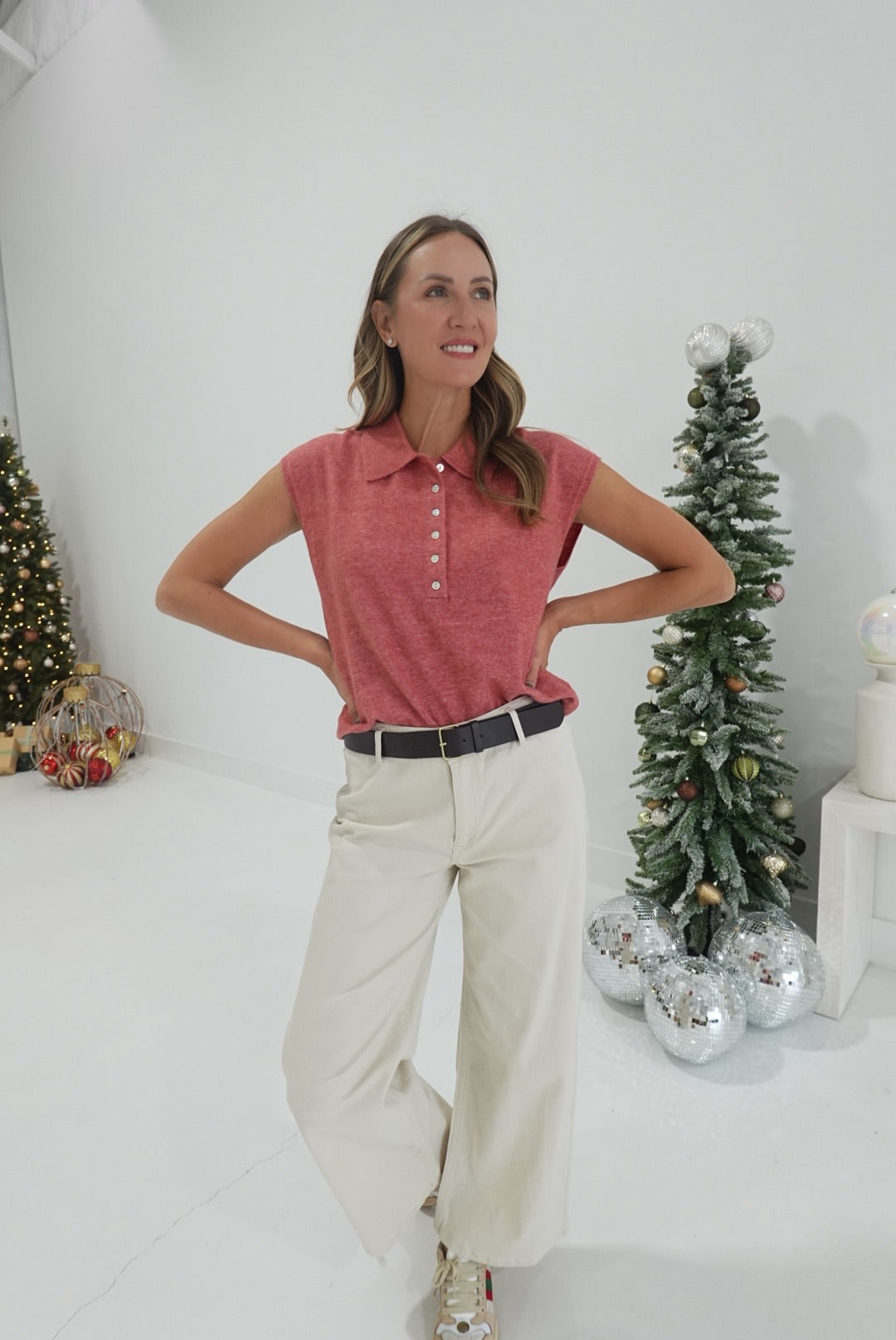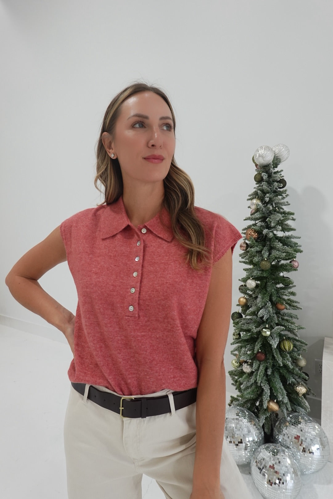 The Holland Sweater Top combines comfort and style with its cap sleeves and classic collar. Featuring a half button-down placket, it offers easy wear and a flattering fit. Perfect for layering or wearing on its own, this top provides a versatile option for your everyday wardrobe. Its soft fabric and thoughtful design ensure you stay comfortable while looking polished.