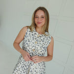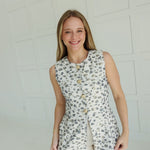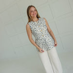 Don't let the plain white top fool you - the Holland Top in Navy is anything but ordinary. Featuring an abstract pattern jacquard and gold accents, this sleeveless vest top not only adds a pop of color to your outfit but also offers the practicality of side pockets. Fully lined and lightweight, this top is perfect for any occasion.