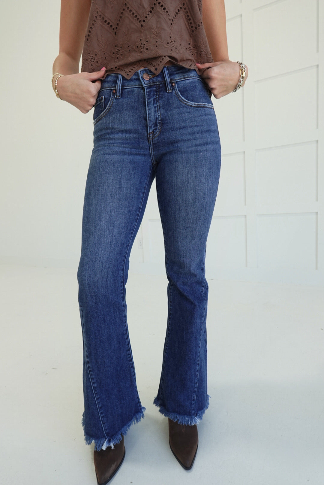 Home Grown Flare Jeans deliver bold, unapologetic style with a mid-rise cut that flatters and flows. The signature side seam detailing adds an edgy dimension that sets these apart from everyday denim. Flared legs create movement and attitude, perfect for those ready to make a statement. Versatile enough for casual confidence or dressed-up edge, these jeans are built for women who refuse to blend in.