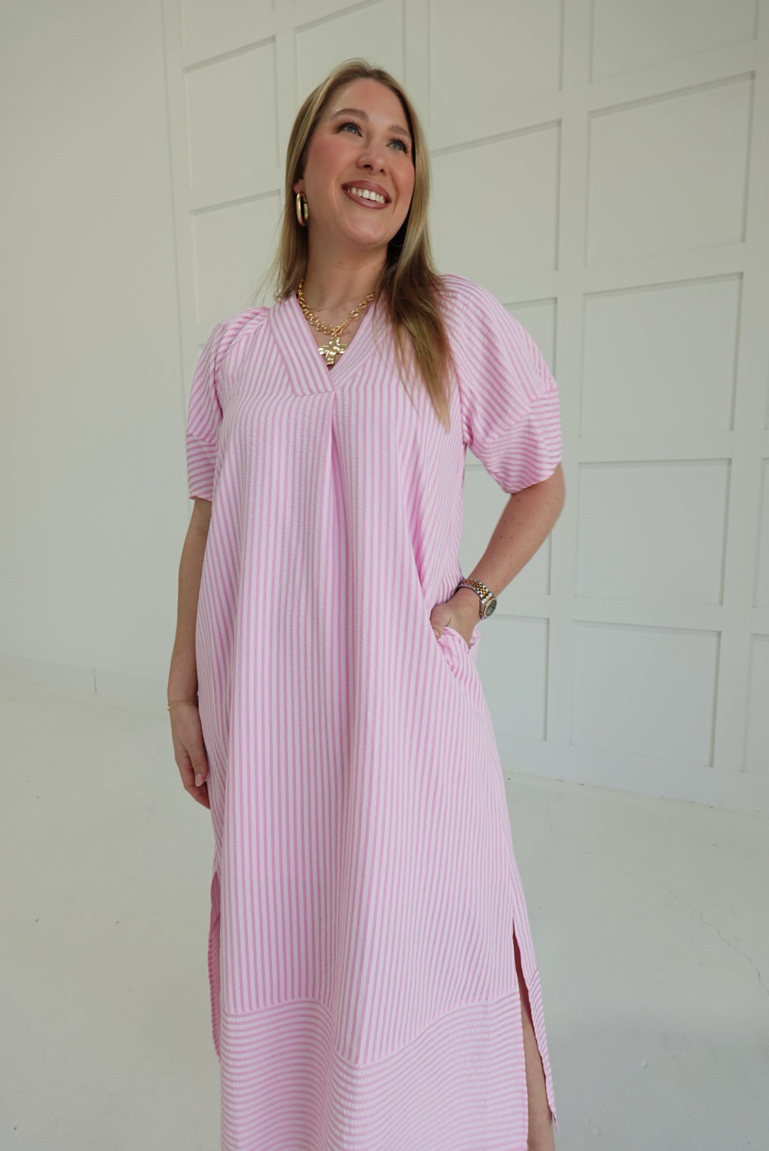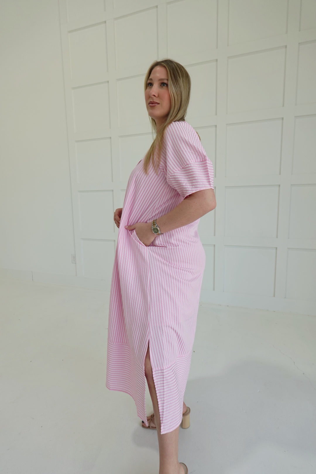 The Ida Midi Dress combines comfort and style with its lightweight woven fabric and unique stripe pattern texture. Designed with raglan lantern sleeves and slit side hems, it offers ease of movement while maintaining a flattering silhouette. Thoughtfully lined and non-sheer, this dress includes convenient side pockets for practicality. Perfect for everyday wear, it provides both function and fashion in one supportive piece.