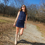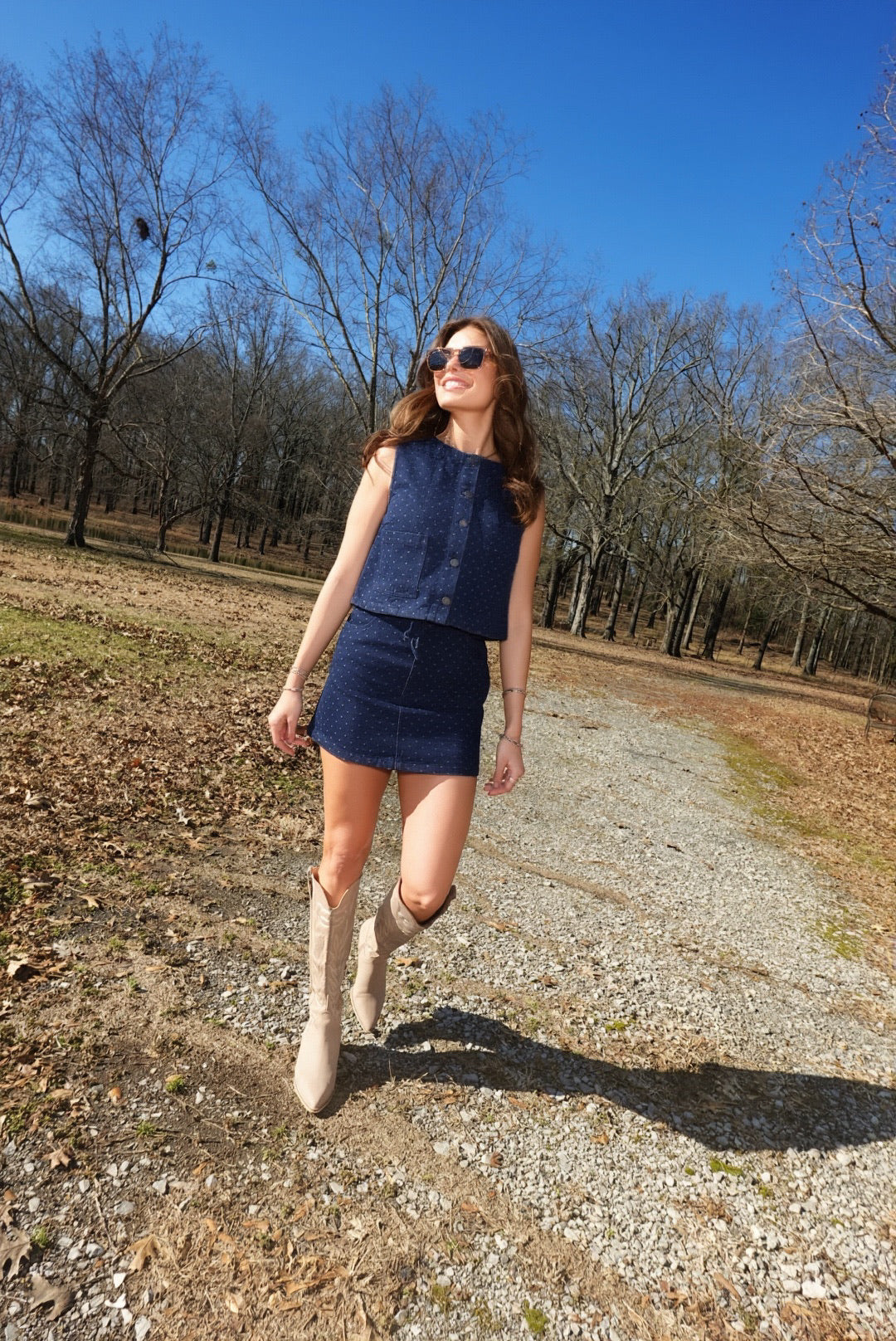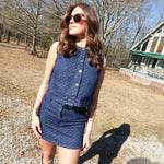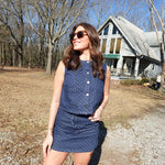 Make a statement in this bold two-piece set that demands attention. The cropped sleeveless button-down features playful polka dots that pop against classic denim, while the matching mini skirt delivers edge and attitude. Perfect for those ready to turn heads and own the room. Pair it together for maximum impact or mix and match for versatile styling that refuses to blend in.