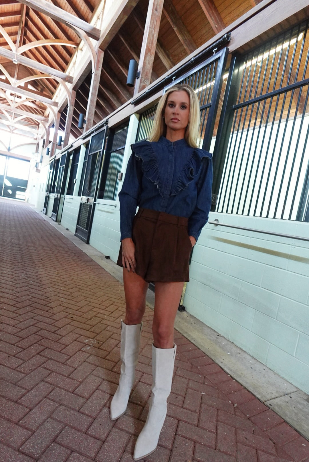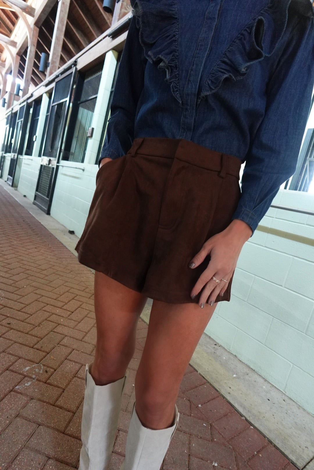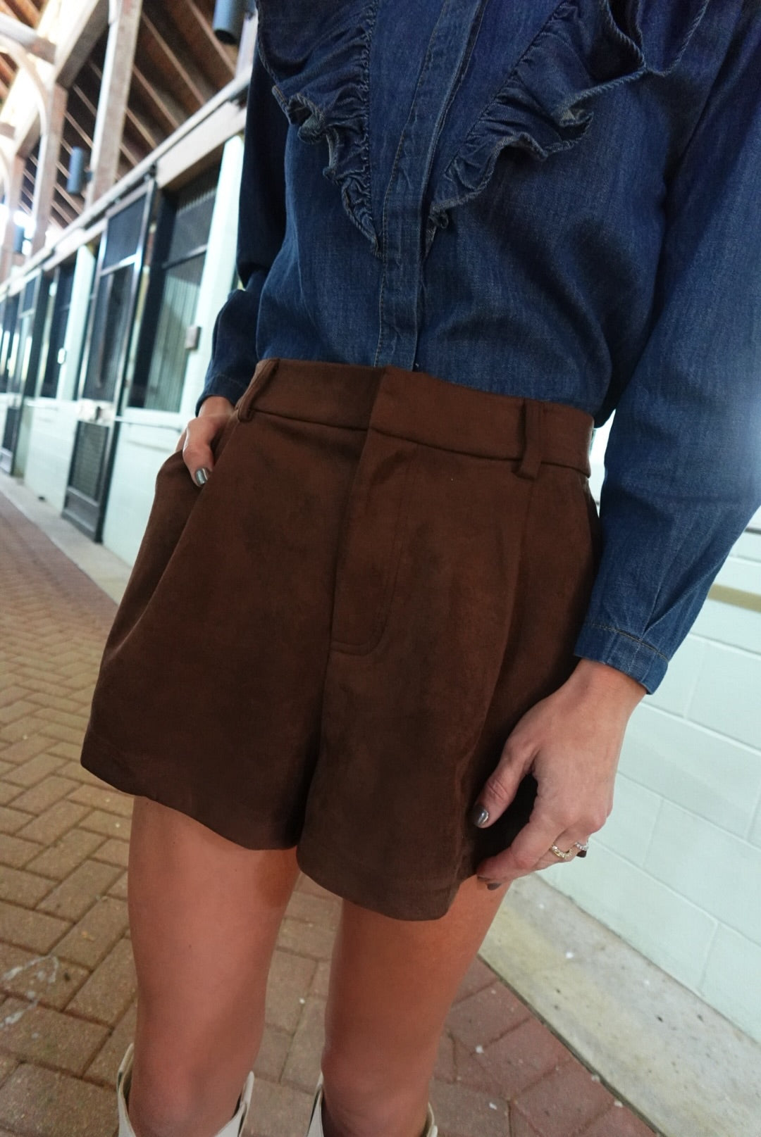 These high-waist suede shorts in a soft tone offer a flattering fit and a luxurious feel. Designed to elevate your casual wardrobe, they combine comfort with style, making them perfect for warm days when you want to look effortlessly chic. The suede material adds a touch of sophistication, while the high waist enhances your silhouette for confidence in every step.