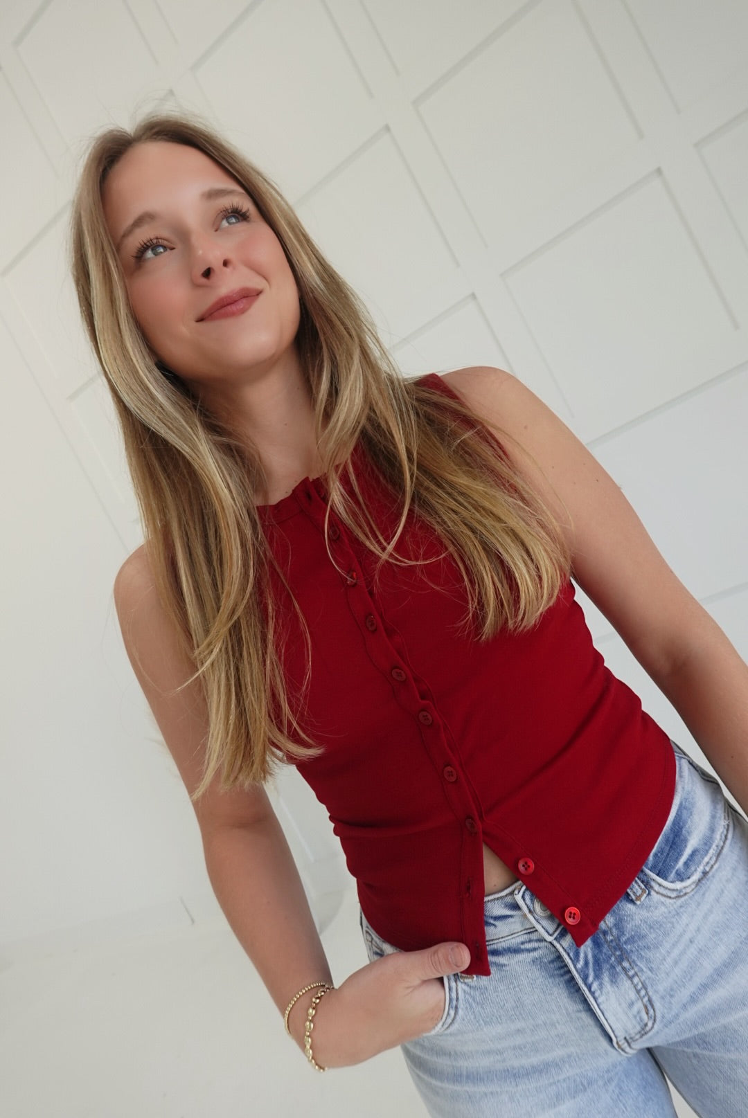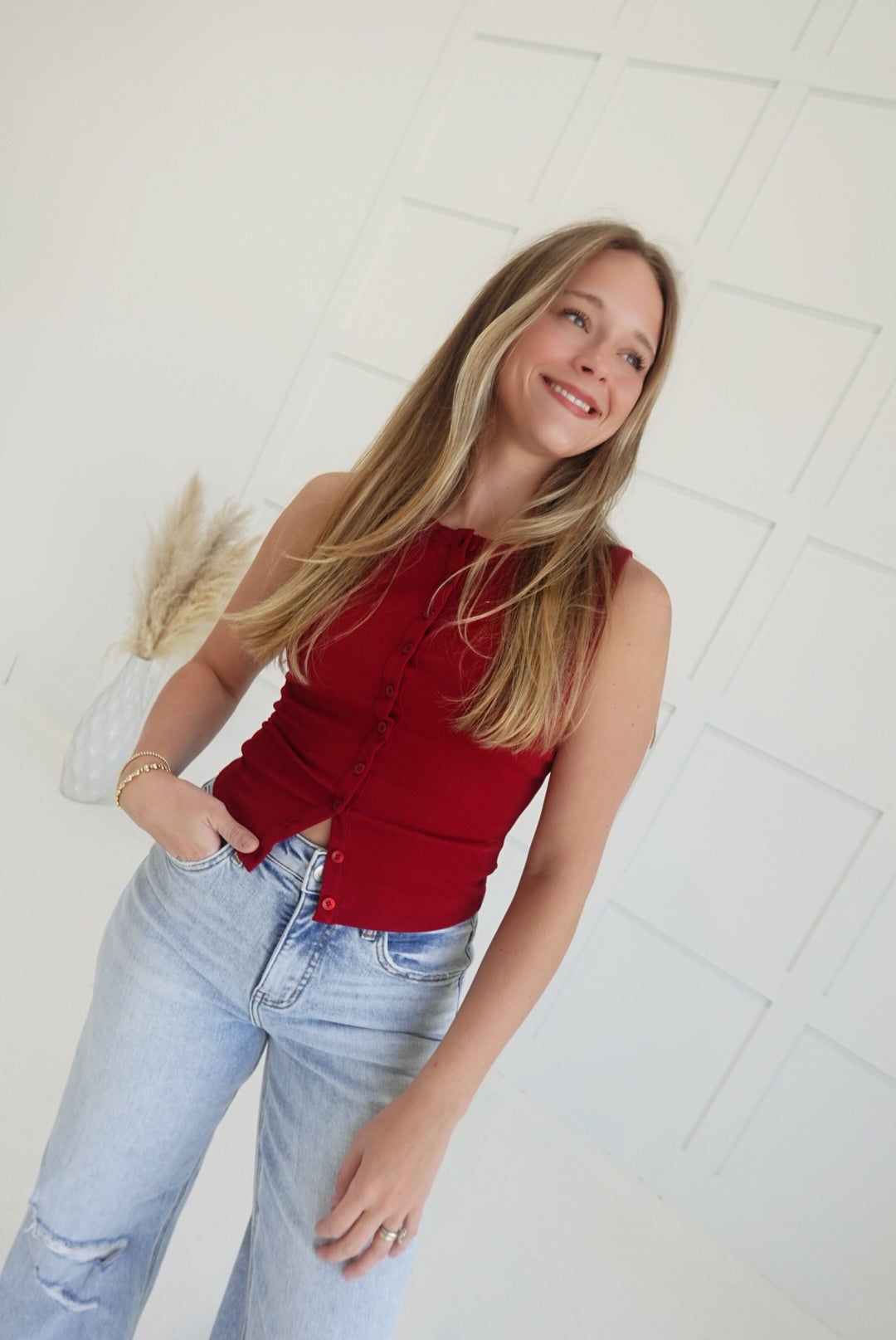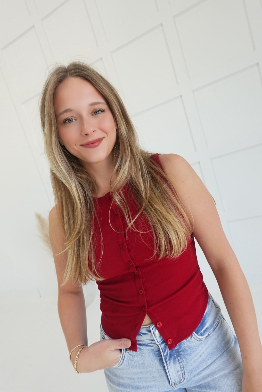 This sleeveless button-down knit top embodies refined versatility with its clean silhouette and thoughtful proportions. The solid design offers enduring sophistication while remaining distinctly contemporary. Its carefully crafted meet-and-greet length creates an elegant line when paired with tailored trousers or statement wide-leg jeans. A considered investment piece that transitions effortlessly between occasions.