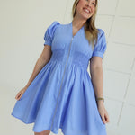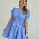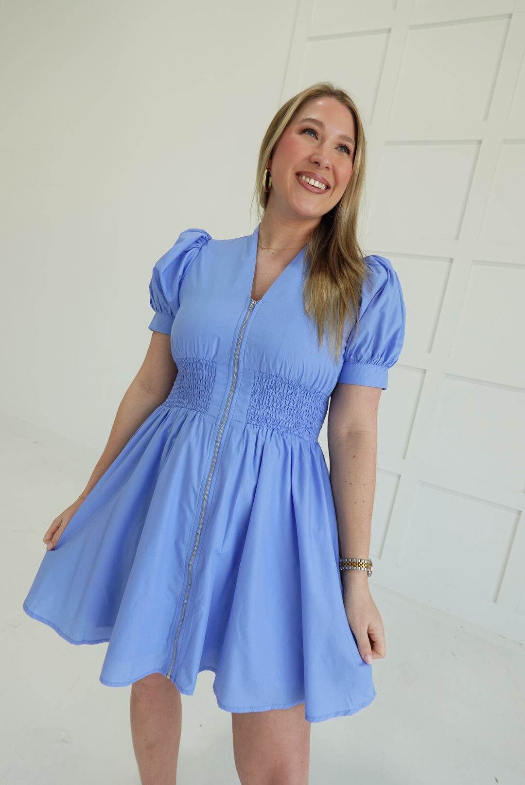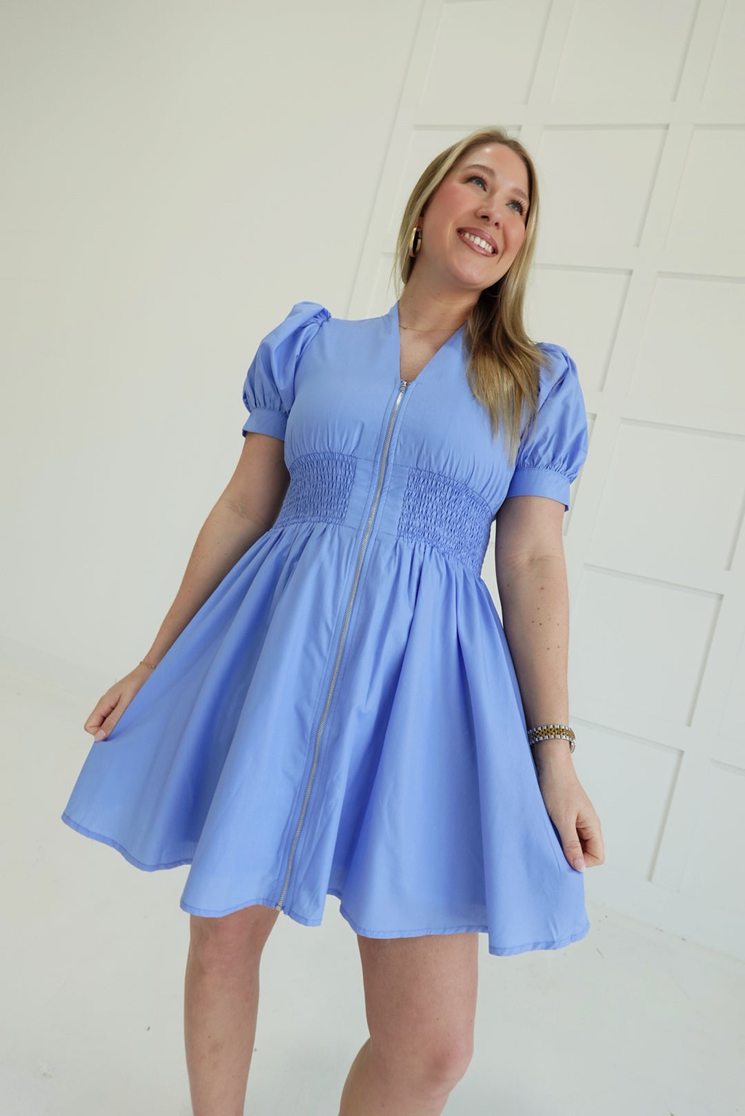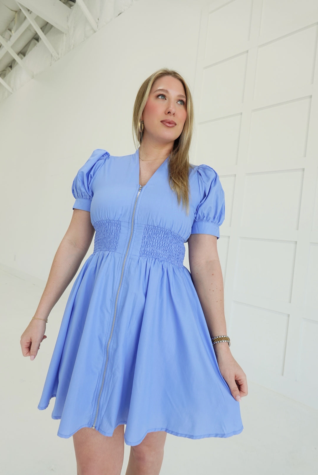 This mini dress combines comfort and style with its solid color and short puff sleeves. The smocked waist offers a flattering fit, while the front-zip closure makes it easy to wear. Lightweight and fully lined, the woven fabric ensures it’s non-sheer and perfect for warm days. Convenient side pockets add practicality without sacrificing elegance. A versatile piece that supports your confidence and ease throughout the day.