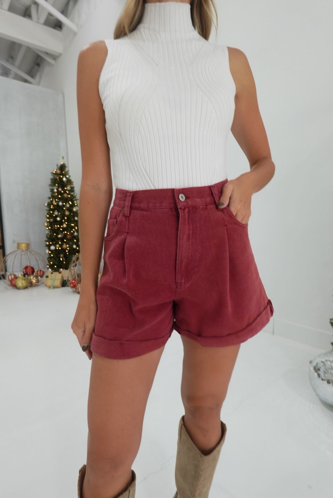 Elevate your casual wardrobe with these versatile cuffed shorts in a sophisticated tone. Crafted from lightweight, non-sheer denim, they feature a flattering high-waist silhouette with rolled-up hems and subtle pleated detailing at the front. The secure button fly-front zipper closure pairs with an elasticated back waistband for all-day comfort, while the classic 5-pocket design keeps your essentials within reach. Unlined and woven for breathability, these shorts transition effortlessly from weekend errands to relaxed social outings.