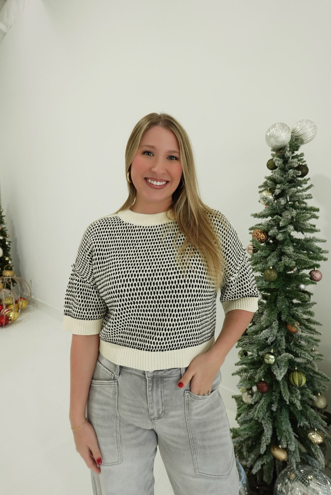 The Janie Contrast Sweater pushes boundaries with its bold multi-stitch construction and striking contrast trim detailing. This short-sleeve knit delivers edge through unexpected color blocking and textured stitching that refuses to blend in. Perfect for those who dress to stand out, it layers fearlessly over basics or commands attention worn solo. Crafted for the confident wearer who treats fashion as self-expression.