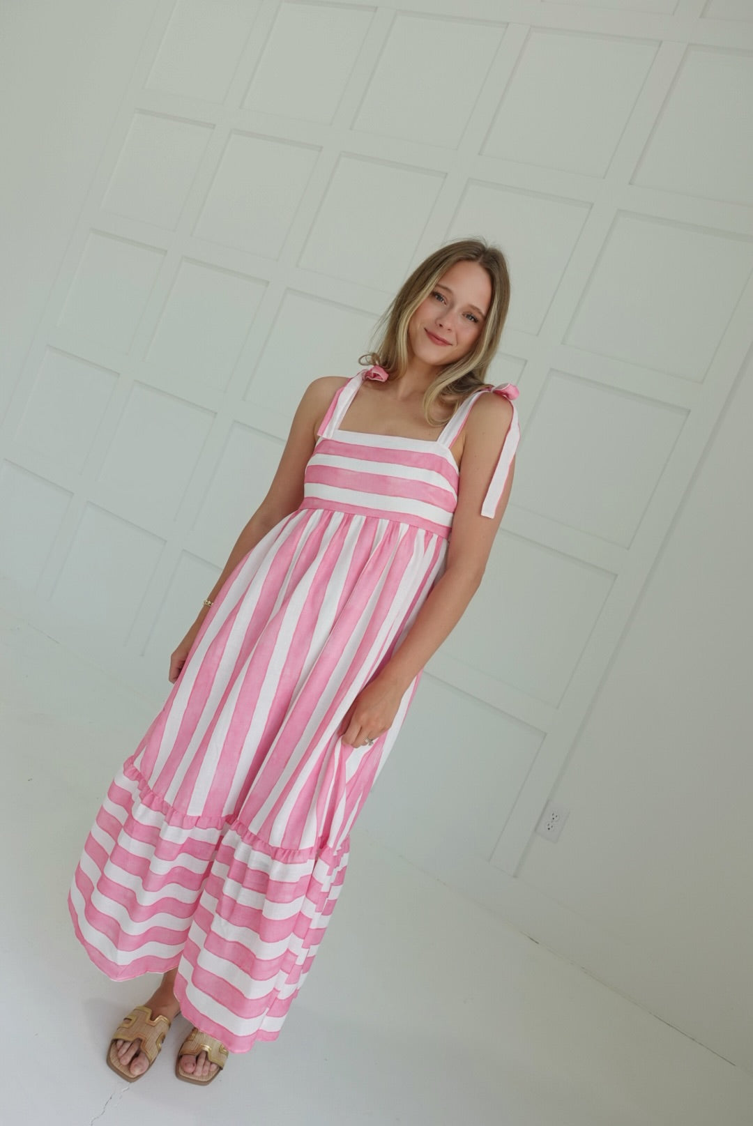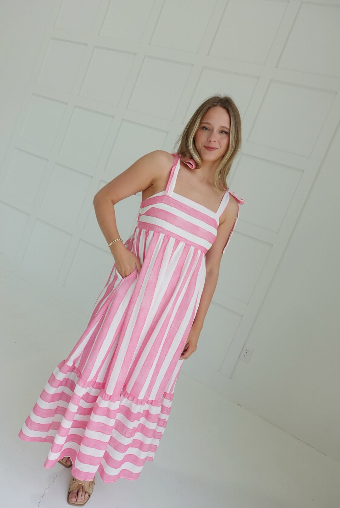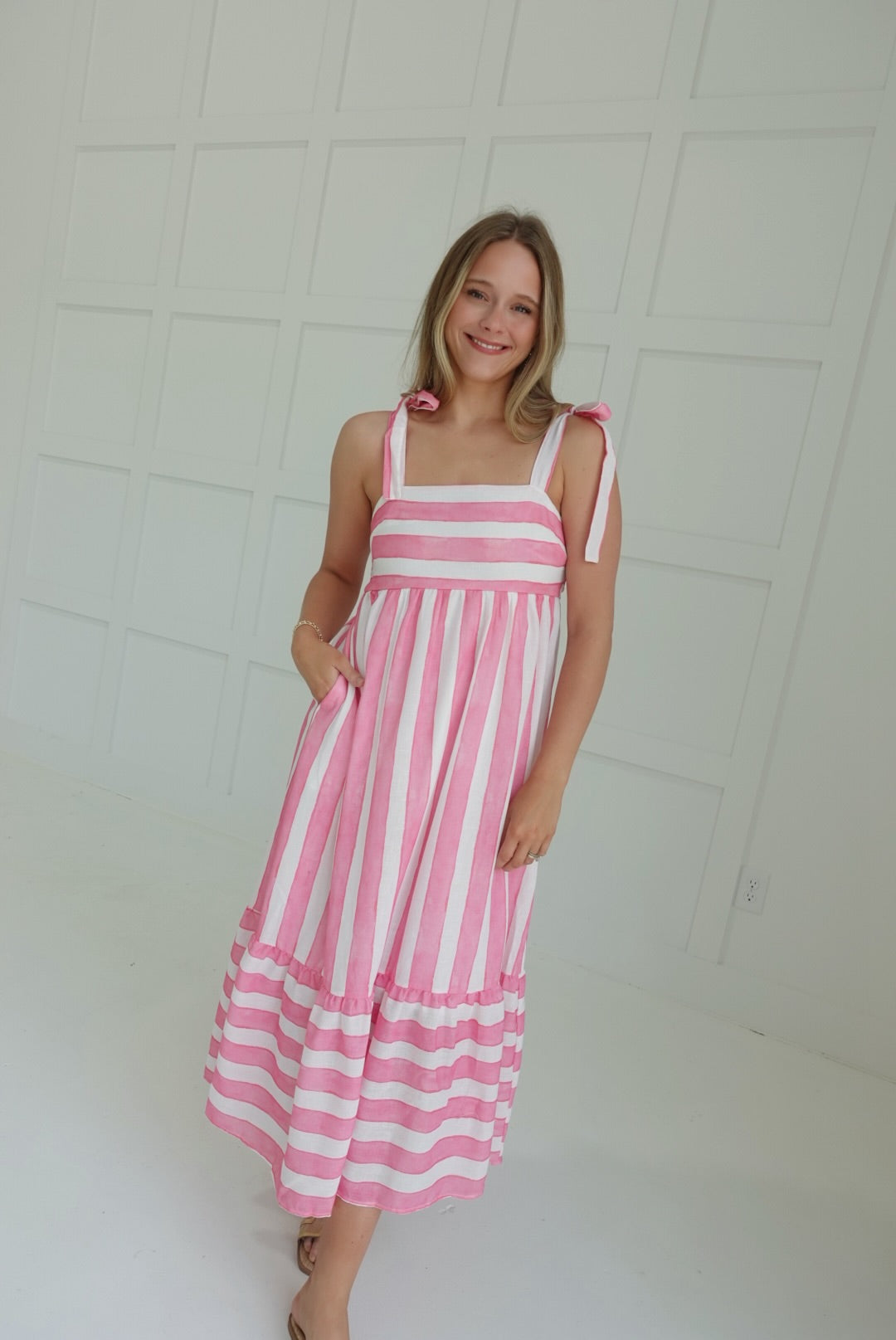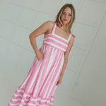 Slip into summer-ready style with our Janie Midi Dress in cool blue! This flirty number features charming stripe details and shoulder ties that dance in the breeze. Perfect for beach days, brunches, or anywhere your adventures take you. The midi length keeps things breezy yet sophisticated – just add sandals and you're good to go!
