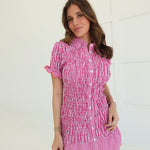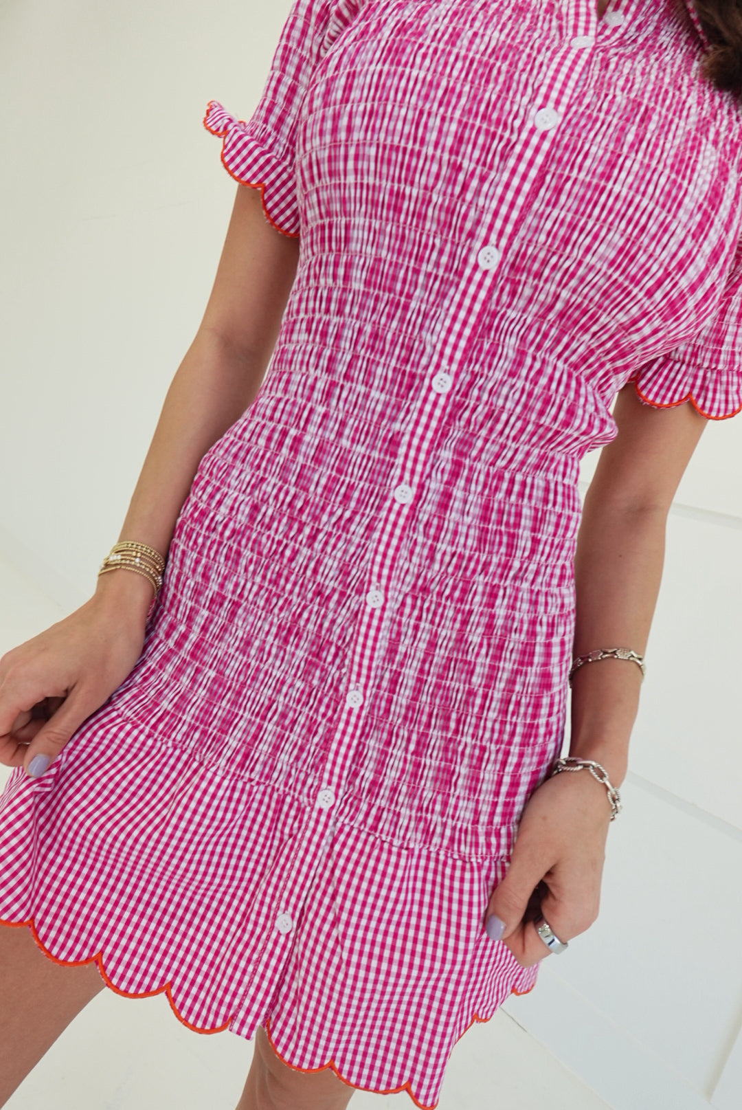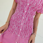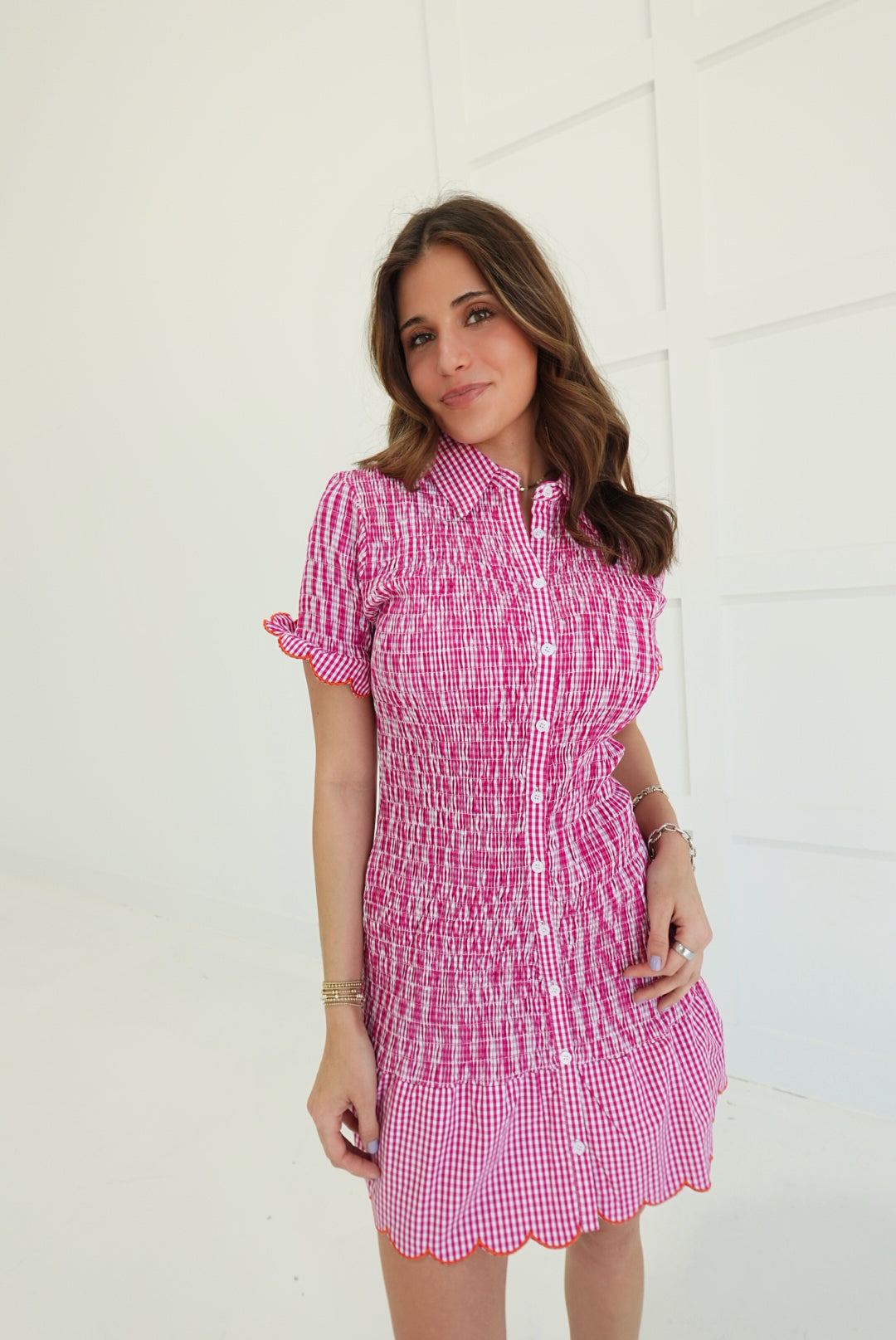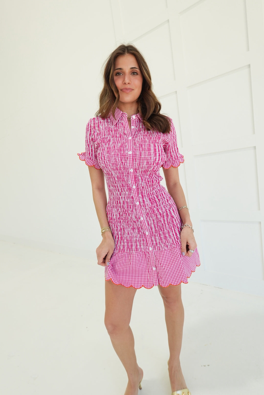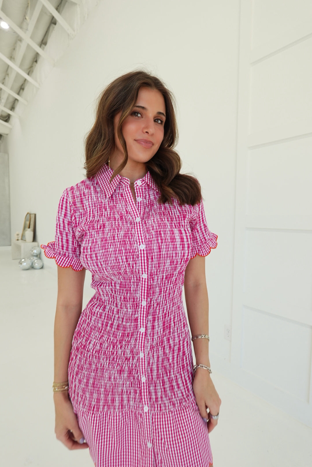 The Janie Smocked Dress commands attention with its bold gingham pattern and expertly crafted smocked bodice that sculpts and flatters. Crisp button-down front adds an edge of rebellion to a timeless silhouette—perfect for those who refuse to play it safe. The smocking detail creates dimension and movement, while the structured bodice ensures a confident fit. Versatile enough to transition from day to evening, this dress proves that classic construction and daring style aren't mutually exclusive.