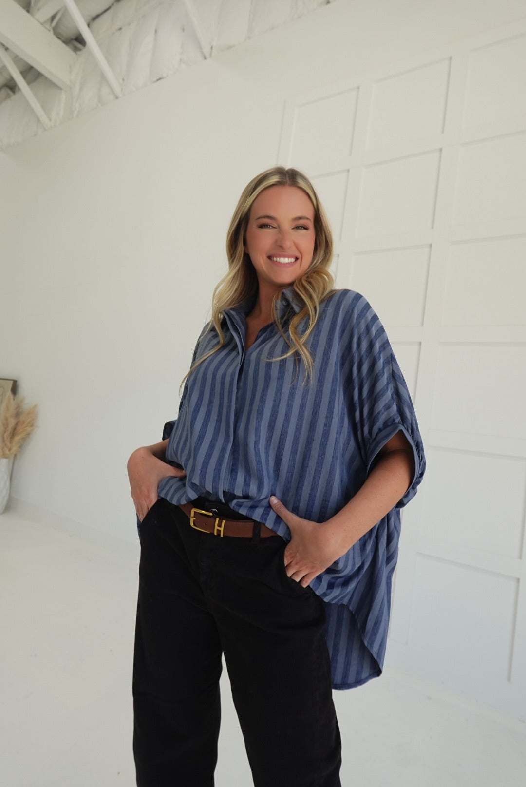 The Jasper Oversized Top offers a relaxed, comfortable fit with its collard design and button-down front. Perfect for layering or wearing on its own, this shirt blends casual style with effortless sophistication. Its roomy silhouette ensures all-day comfort while maintaining a polished look for any occasion.