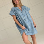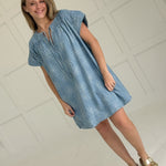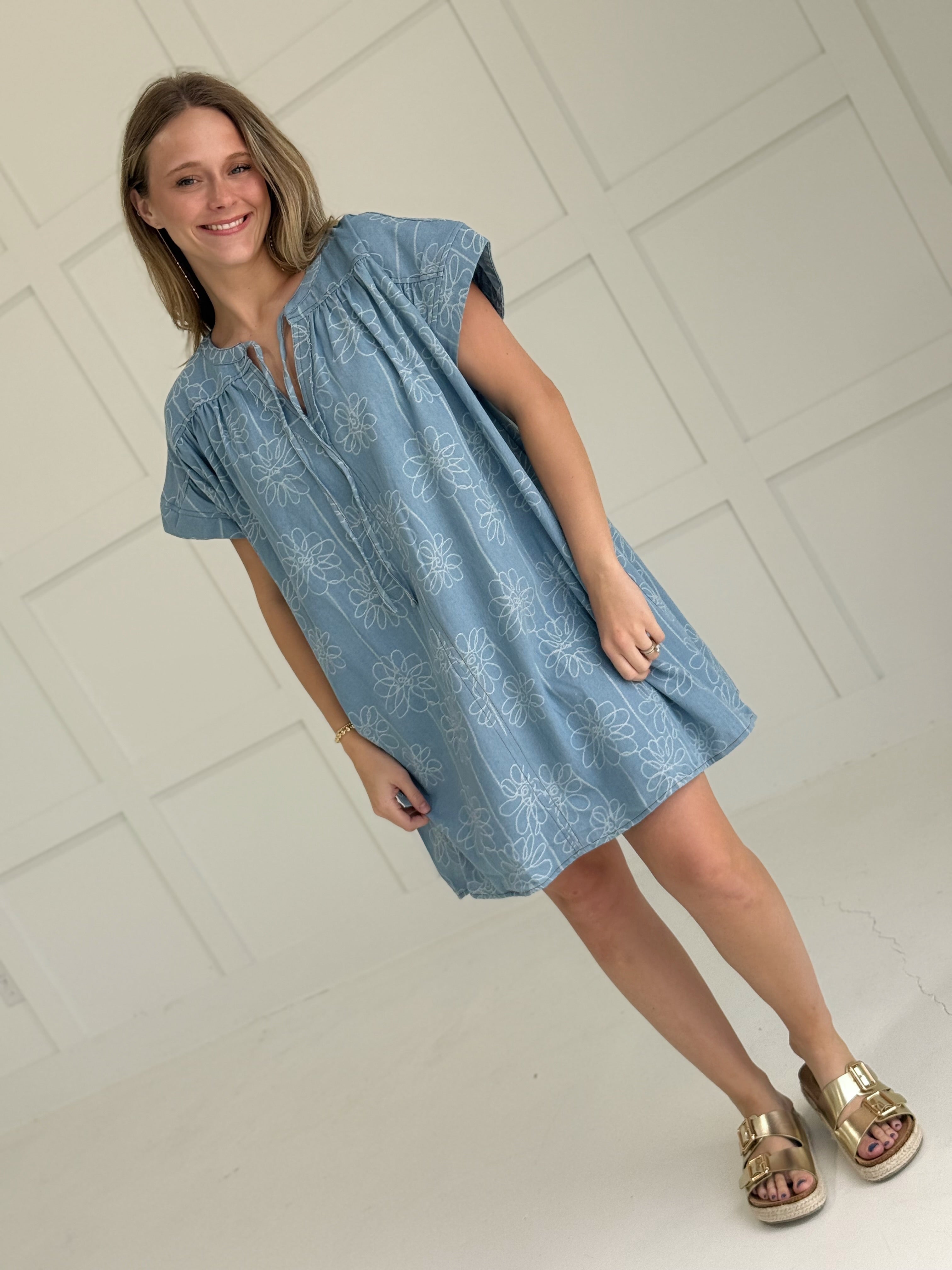 The Jennings Denim Dress features a sophisticated floral print with a distinctive notched v-neck and self-tie detail. Its loose, flowing silhouette offers both comfort and contemporary style. This versatile piece perfectly captures current fashion trends while being ideally suited for country concerts, fairs, and other casual outdoor events.
